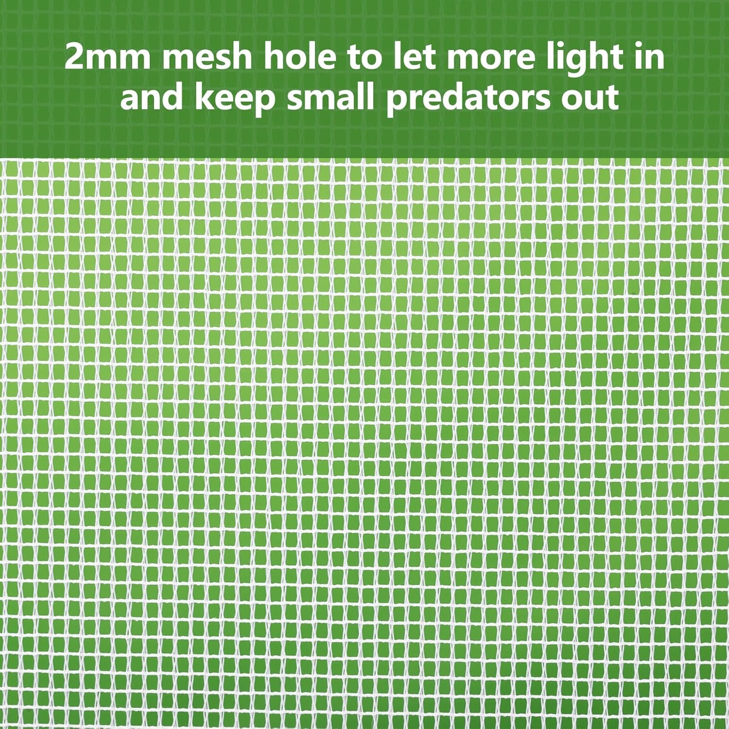 About 1/8″ (2mm) square mesh size to let more light in and keeps out birds, butterflies and other garden pests.