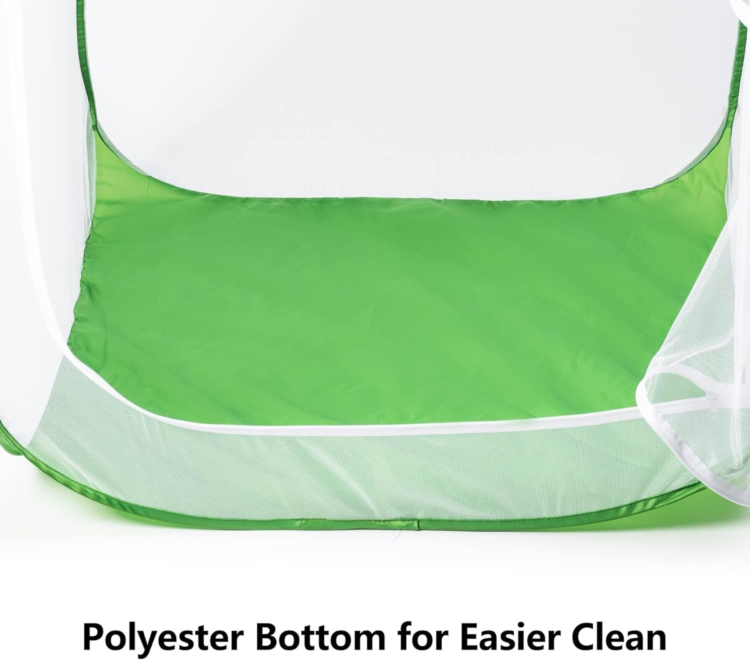 Coarser mesh material for durable use. Polyester Bottom for Easier Clean. Assembles instantly, no tools needed, just slip off the elastic strap from around the circle, the cage can pop open.