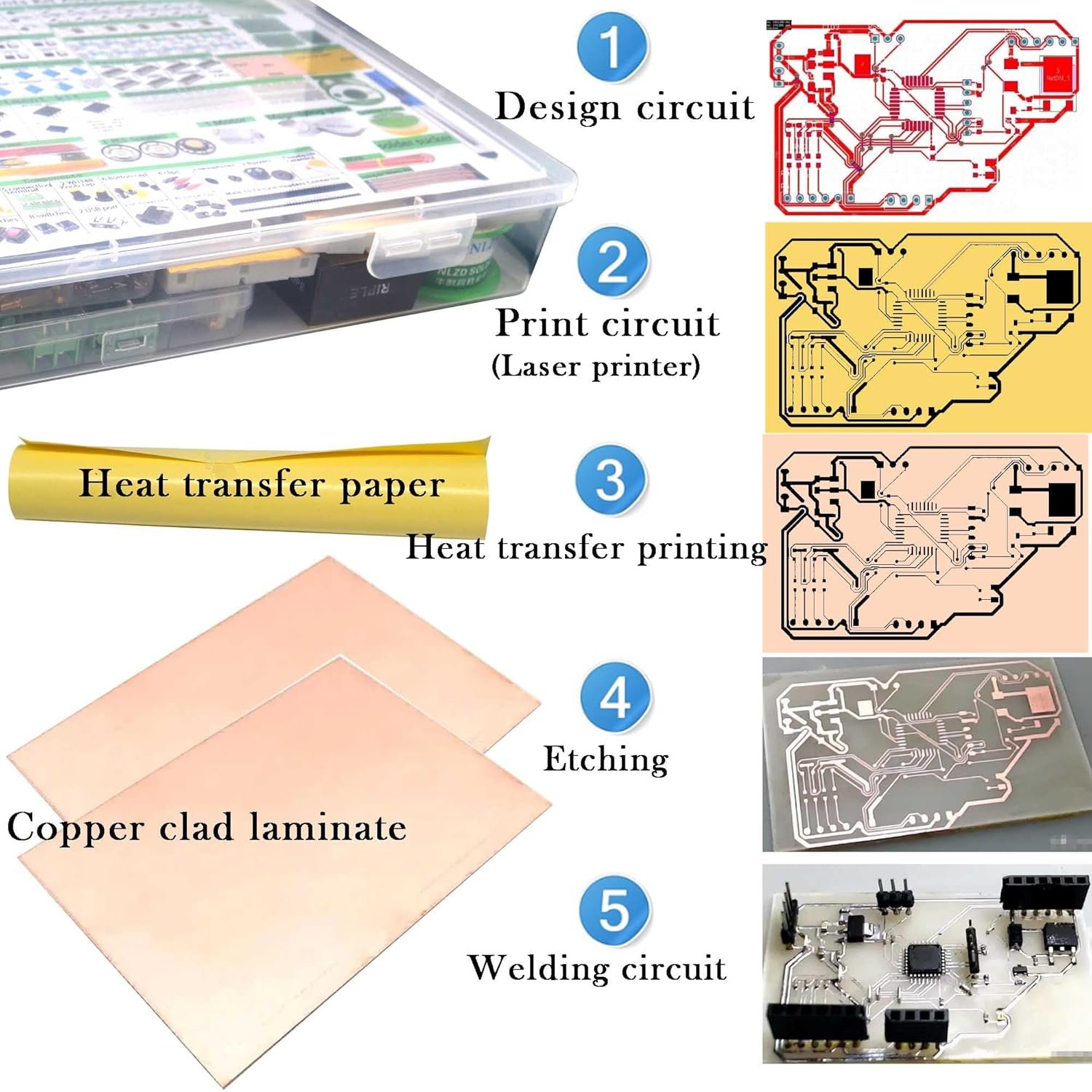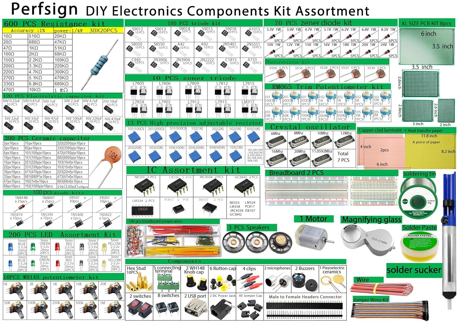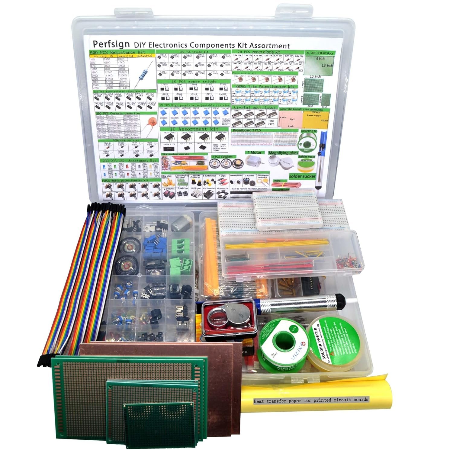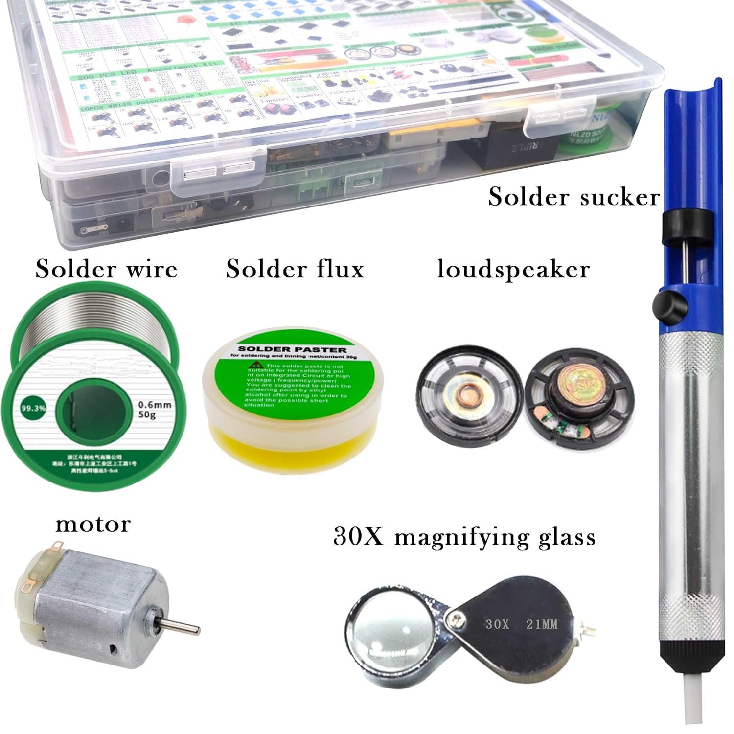 Contain:Resistors, Inductors, Capacitors, LED, Triode, IC,Solder,Solder Paste,Solder Sucker,PCB,Breadboard,Jumper Wire,Diodes,Potentiometer, USB Port,DC power jack,Pin Header,Terminals,Tactswitch,buzzers,piezoelectric ceramics,connecting terminal,hex stud,motor,speakers,magnifying glass,ETC。