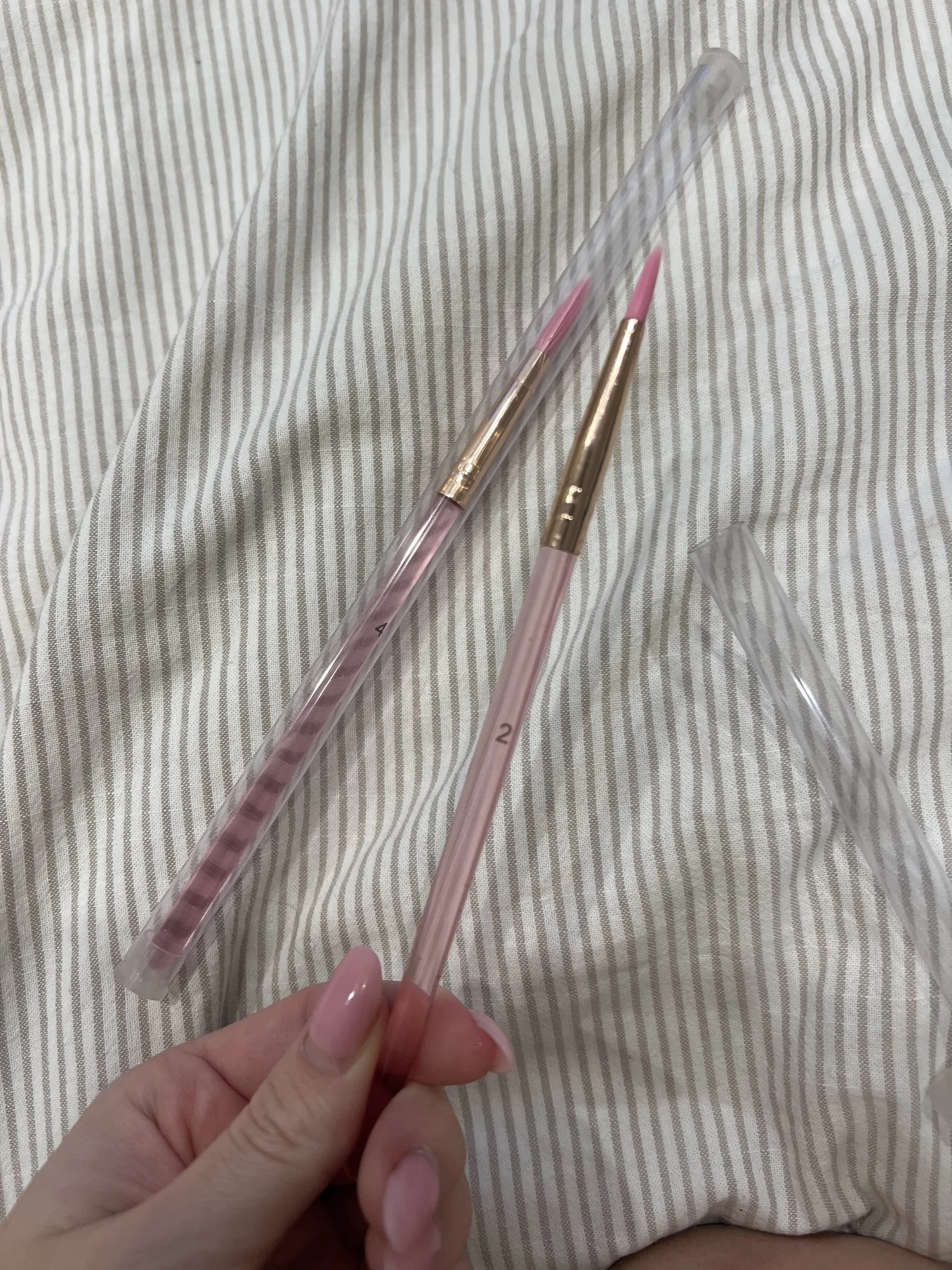 fast delivery. body is transparent. is coated with something, so the tip is hard and sharp. When touched with water, the tip meltes and fluctuates. Each brush has its own case. The thickness of the drawn line depends on the degree of appliedness to the brush.