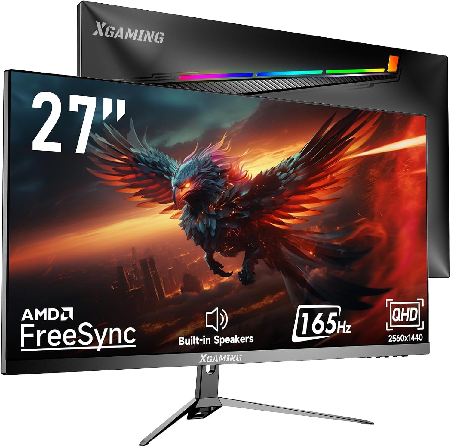 27-inch Gaming Monitor with Speaker, QHD 1440p, 165Hz 98% sRGB, 1ms, FreeSync, Dual HDMI & DisplayPort, LED Rainbow Light, Frameless IPS Screen, VESA Mountable, Black