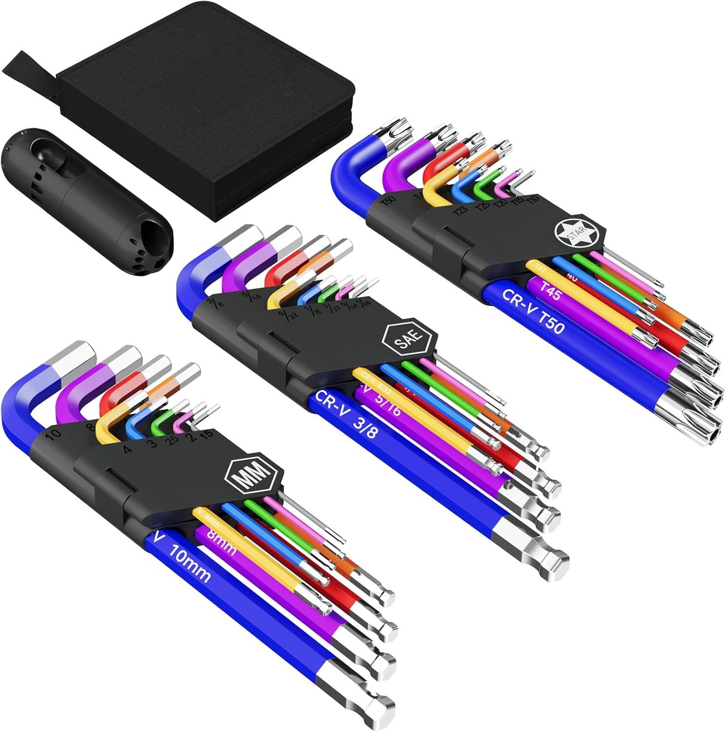 Complete Sizes: 27 Pieces Hex Key Tool, metric (9 PCs): 1.5, 2, 2.5, 3,4, 5, 6, 8, 10mm. Inch (9 PCs): 1/16 5/64 3/32 1/8 5/32 3/16 7/32 5/16 3/8. Star size (9 PCs): T10, T15, T20, T25, T27, T30, T40, T45, T50. Full size for all your needs when repairing.