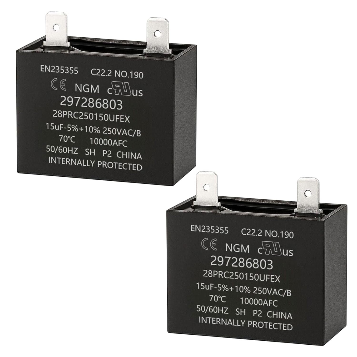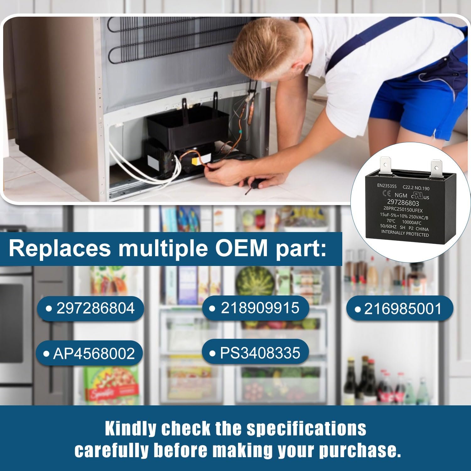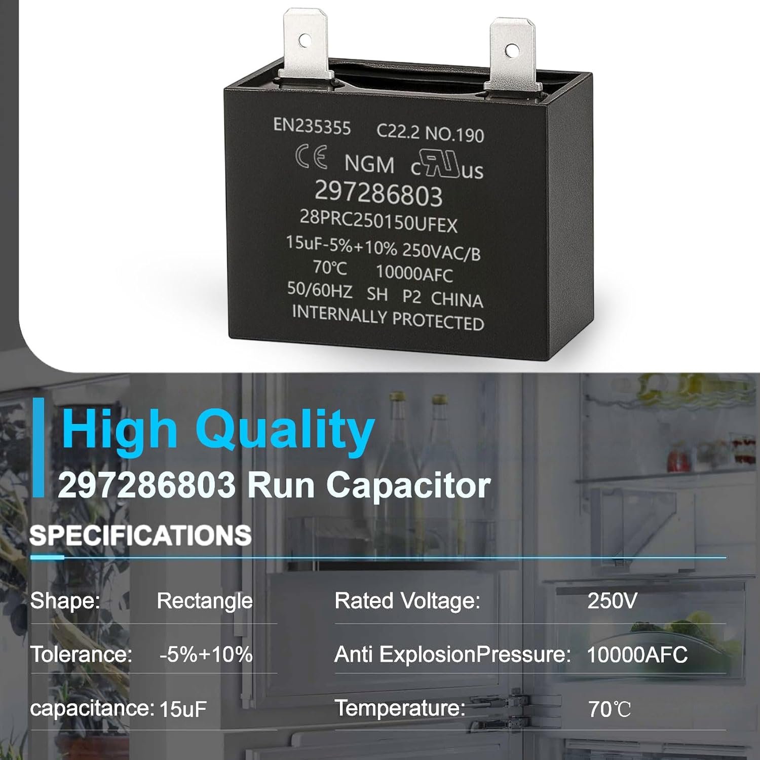 297286803 Run Capacitor Replacement 15μF -5%+10% 250VAC for Refrigerator Freezer Compressor – Fits Models 297286804 218909915 216985001