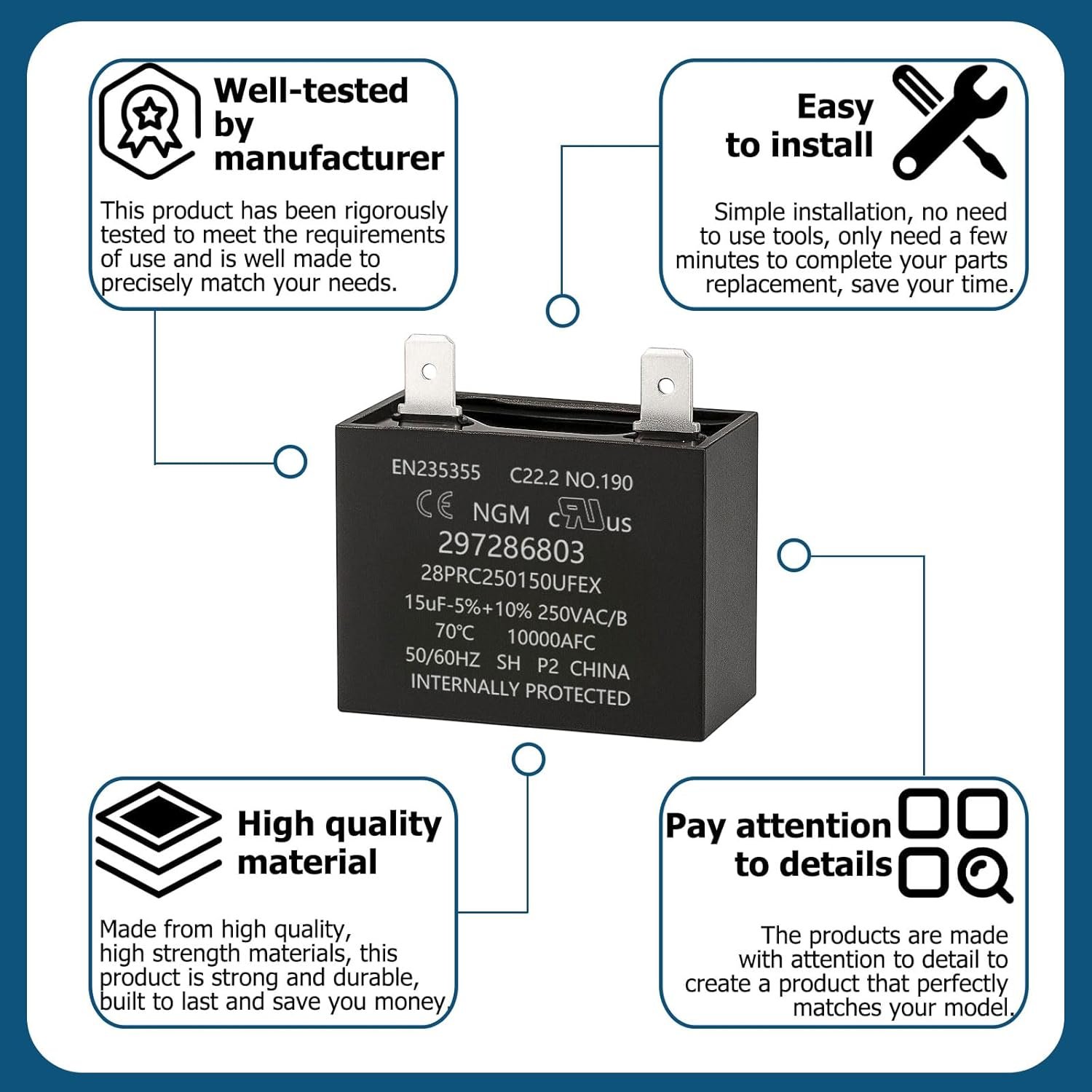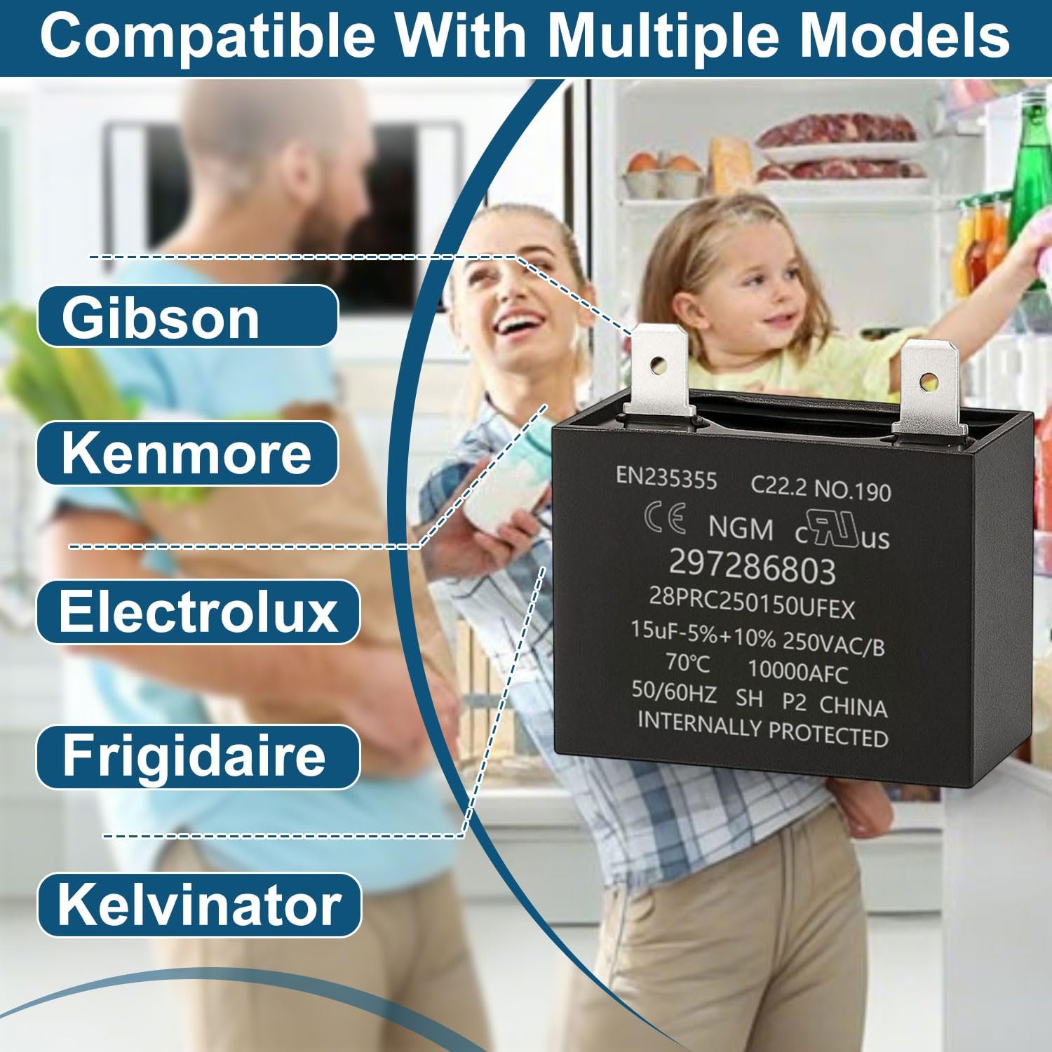 【Direct Replacement Fit】Perfect replacement for Frigidaire 297286803 run capacitor, compatible with multiple models of Frigidaire, Kenmore, Electrolux, Gibson, and Kelvinator refrigerators and freezers.