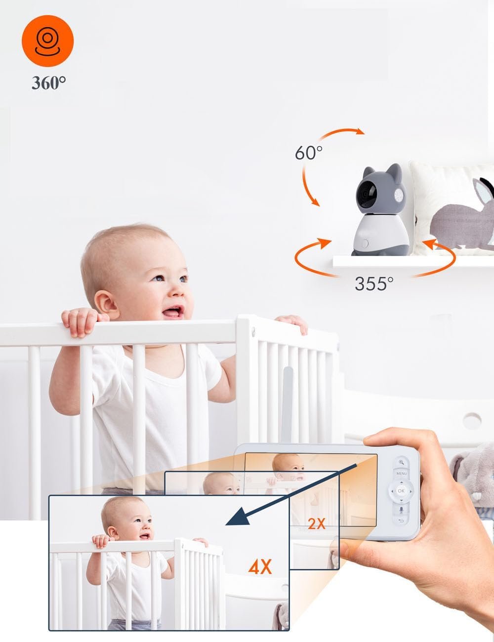 【Flexible Viewing & Wide Coverage】 The Baby Monitor with Camera and App offers 355° rotation, 60° tilt, and 4x digital zoom, giving you complete flexibility to monitor your baby from any angle. Whether you’re using the phone app or the LCD screen, you can keep a close eye on your little one from a distance or up close.