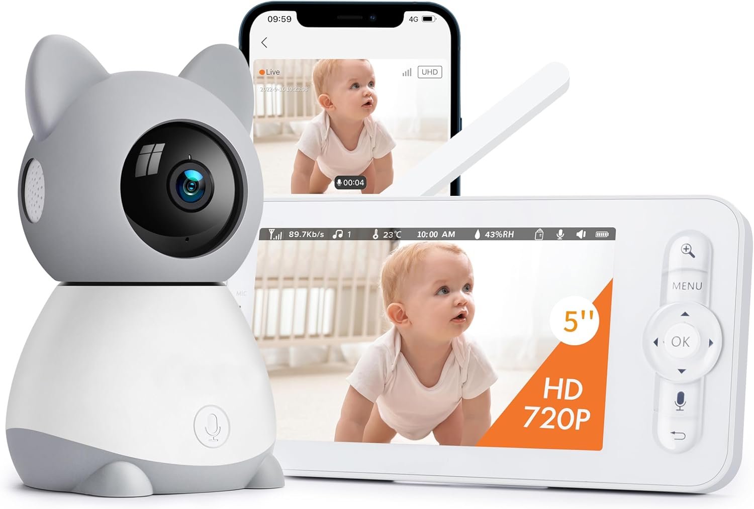 5-inch 720P Display & 2K Camera for clear, sharp imagesClear Night Vision and Two-Way Audio for peace of mindMotion & Temperature Alerts to keep you informedMonitor via Screen (No Wi-Fi Needed) or use the Mobile App for added convenienceFHSS Technology ensures secure, interference-free 2.4GHz channel transmission