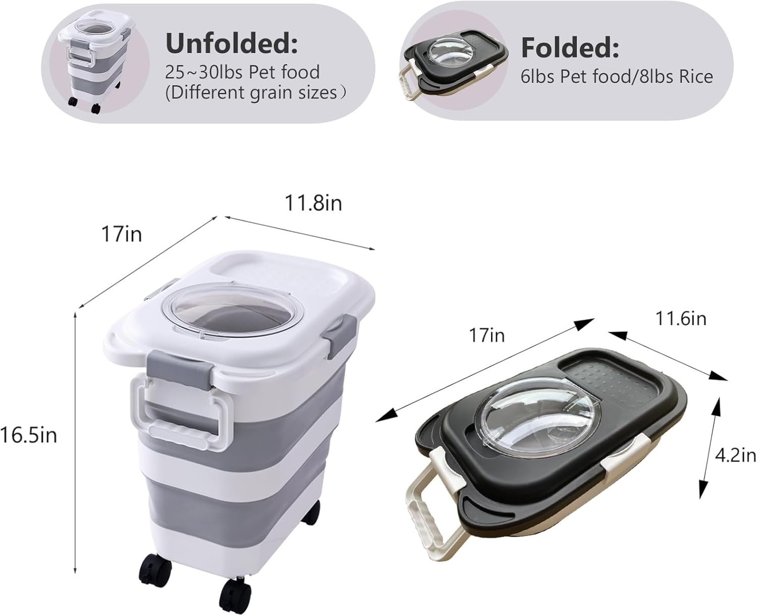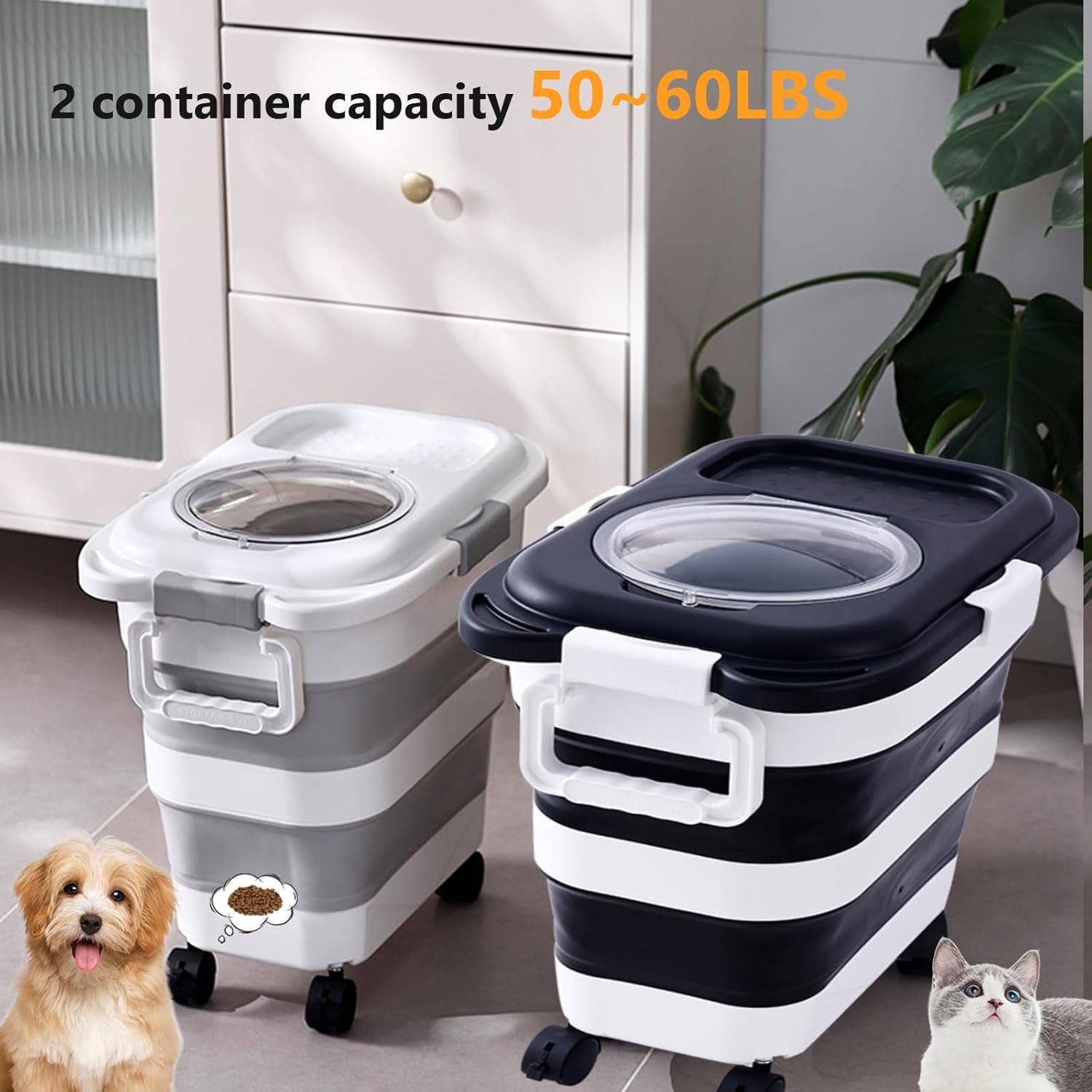 2pack 25 lbs Dog Food Storage Container,Collapsible Dog Food Container with Scoop,Pet/Dog/Cat/Bird Food/Cat litter Storage Containers to Keep Dry,Easy to Move.(Black+white)