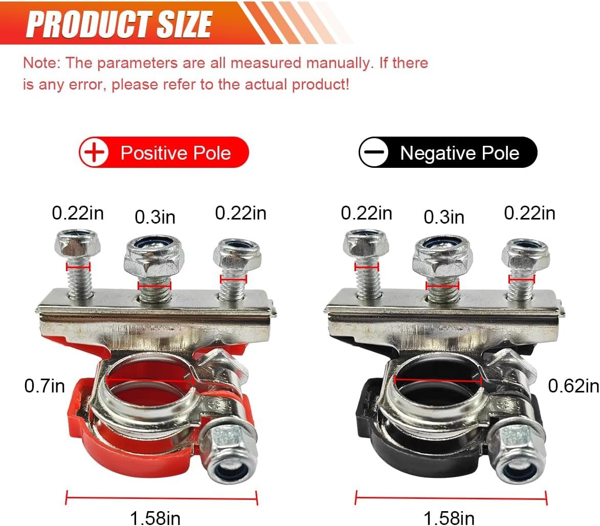 【What Will You Get】:The packaging includes 1 pair of 3-way automotive battery terminal connectors. The length of both terminal connectors is 1.58 inches. The hole diameter of the red terminal connector is 18mm/0.7 inches, and the hole diameter of the black terminal connector is 16mm/0.6 inches. The diameters of the three bolts are 0.22 inches, 0.3 inches, and 0.22 inches, respectively.