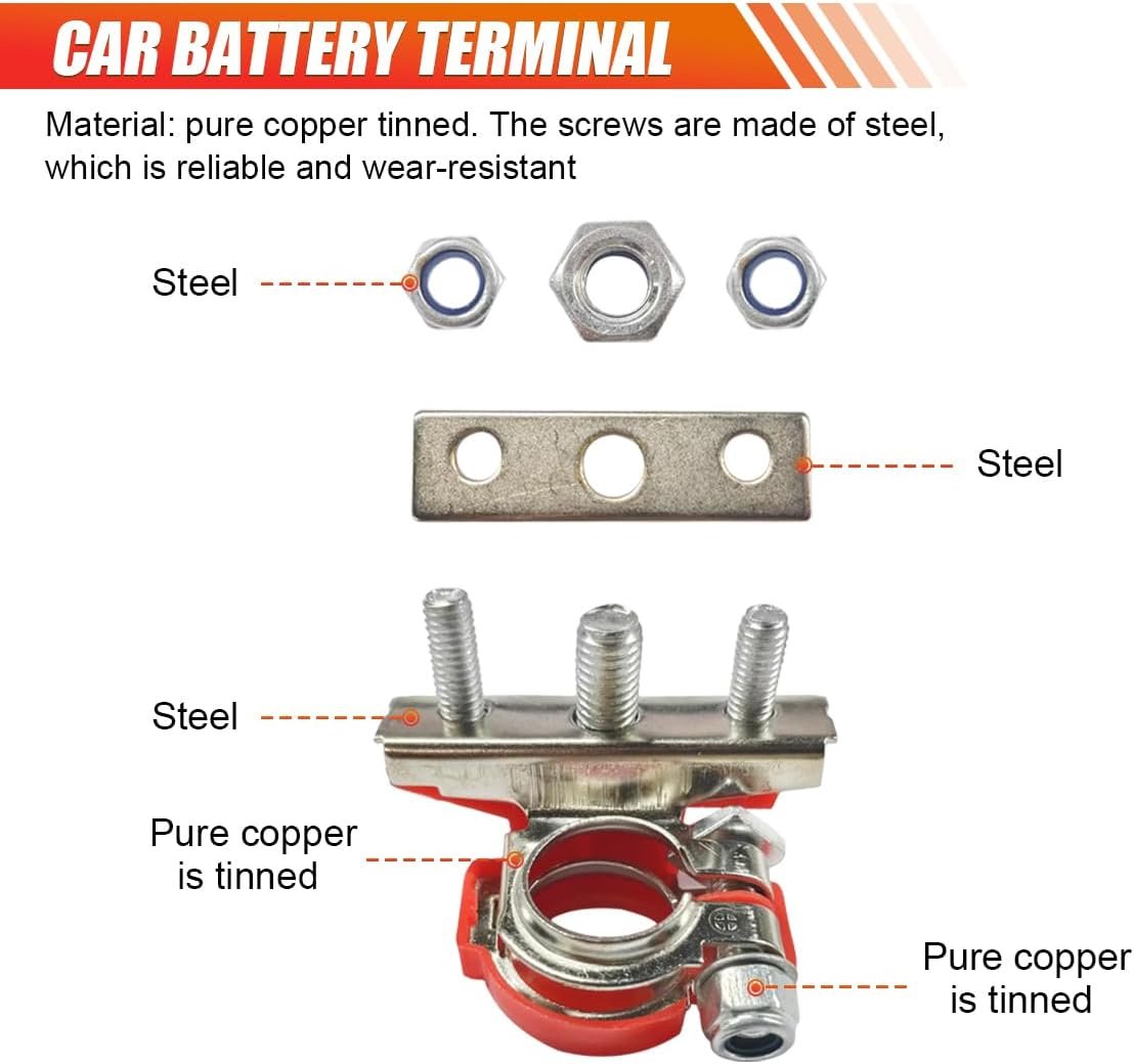 【Great Electrical Conductivity】:This car battery terminal kit is made of pure copper material with tin plating on the surface. The overall structure is sturdy and reliable, rust and corrosion-resistant, and not easily broken or deformed. It can be used in various harsh environments and can maintain its excellent performance even after long-term use. Moreover, it has excellent conductivity and anti-aging ability, which can reduce voltage distortion and transmission loss, and improve the electrical efficiency of vehicles.