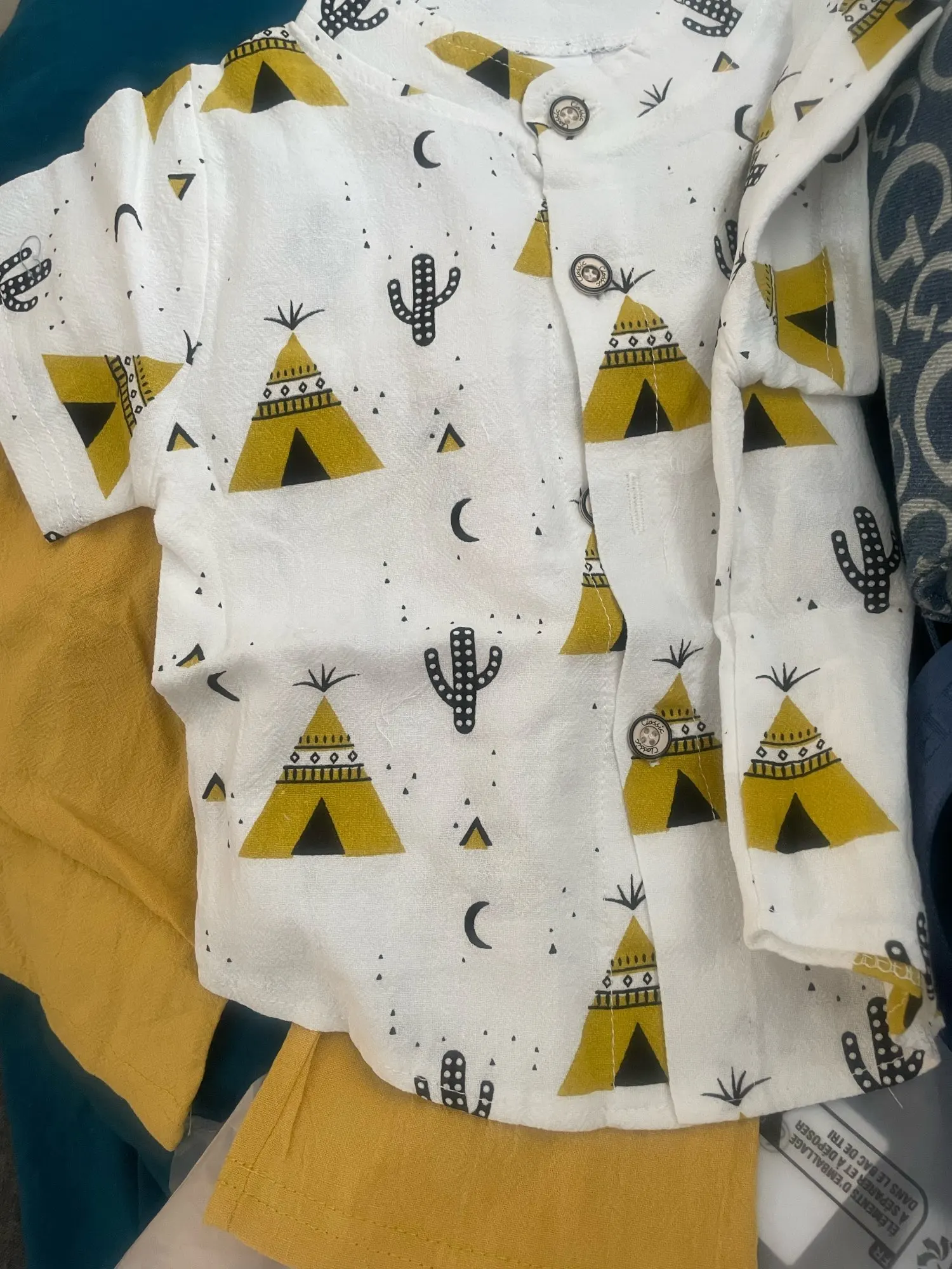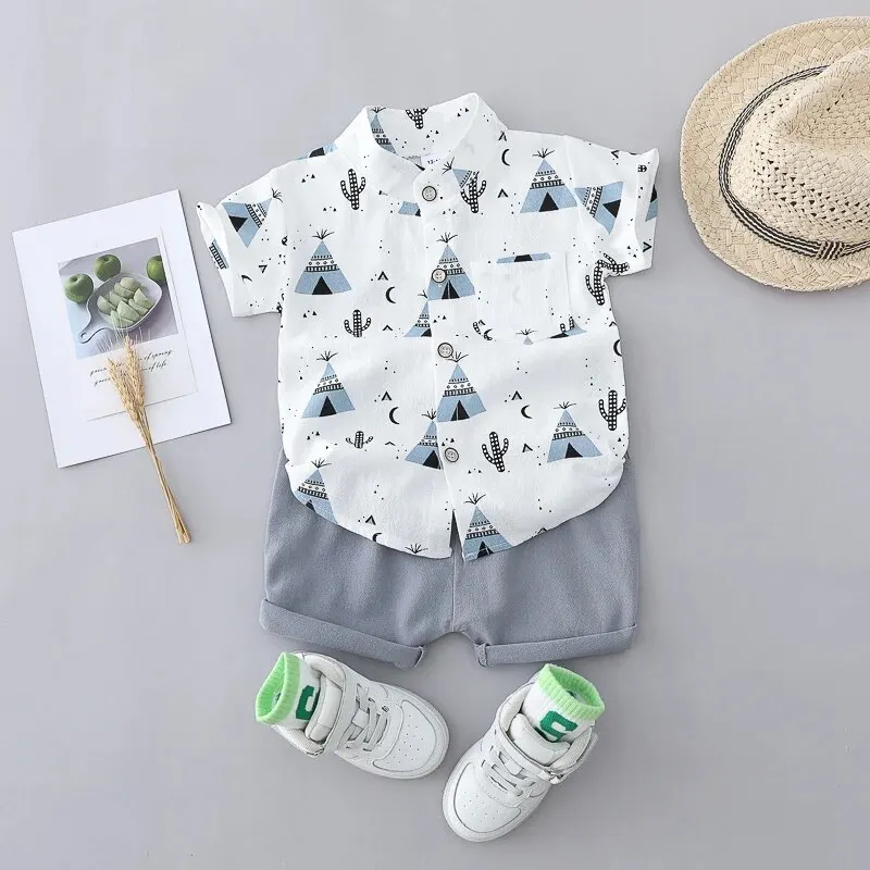 2PCS Children’s Summer 100% Cotton Random Full Print Triangle Pattern Short Sleeved Stand up Collar Shirt and Shorts Set