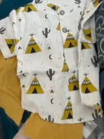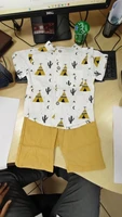10 reviews for 2PCS Children’s Summer 100% Cotton Random Full Print Triangle Pattern Short Sleeved Stand up Collar Shirt and Shorts Set