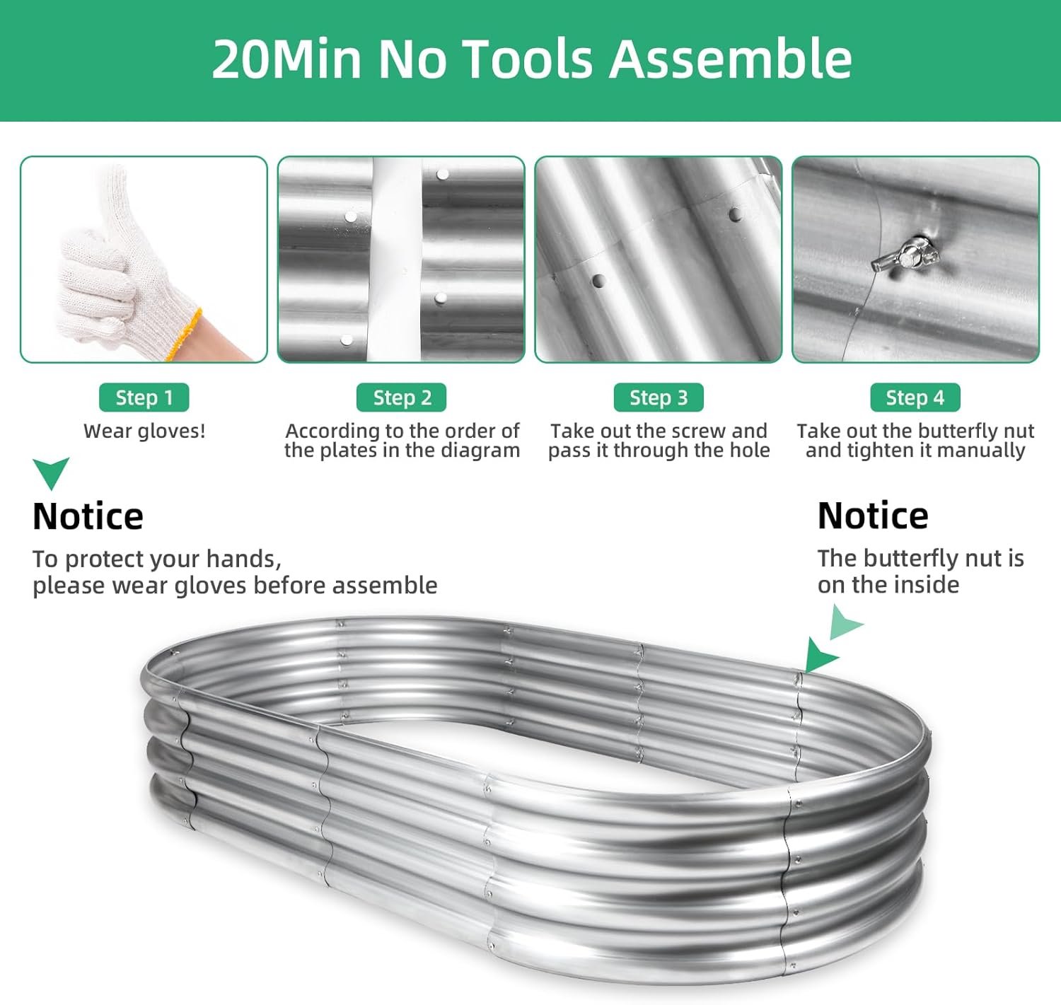【Assembly without Tools】:Our galvanized planter for outdoor plants has been upgraded its accessories with new type of butterfly nuts. Assembly does not require tools, only manual rotation of the butterfly nut is required to tighten two galvanized sheets. More stable than regular nuts, easy to assemble. Notice: Galvanized sheet is heavy, we suggest wearing our gloves for operation.