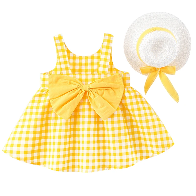 2Piece Summer Toddler Girls Dresses Korean Cute Plaid Sleeveless Cotton Big Bow Yellow Dress+Sunhat Newborn Baby Clothes BC003