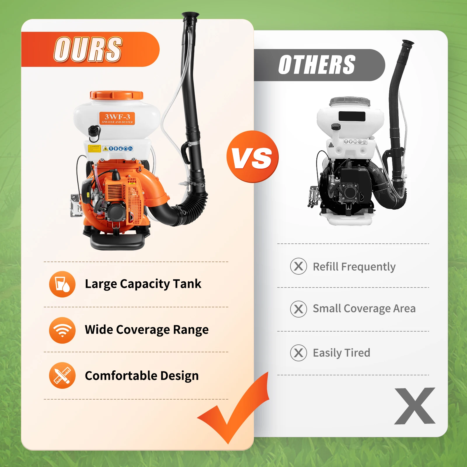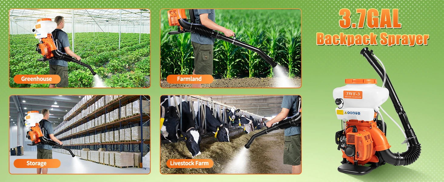 Are you still feeling tired of manual spraying on a large area? This backpack sprayer with 3.7gal large capacity has 2.13kW strong power and 39.4ft wide range, which can achieve accurate spraying operation and evenly care for each leaf vein. It is the guardian of farmland and an ideal choice during the busy farming season. Choosing it will take you into a new era of efficient farming and witness a bountiful harvest!