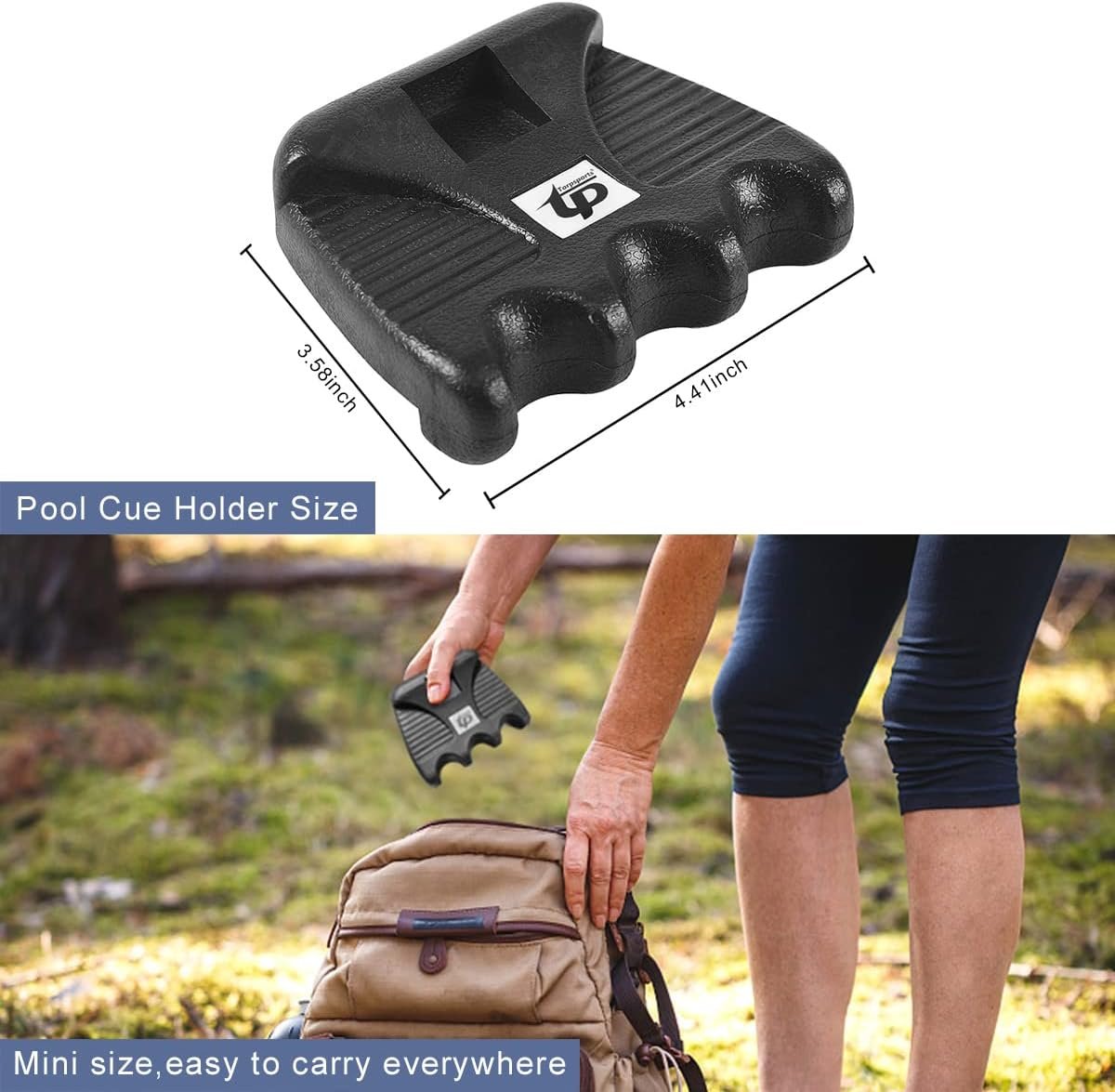 【 Portable Pool Stick Holder 】The billiard cue stick holder edge is rounded and smooth, it would not damage the cue shaft. With arc opening design,it can hold your cue secure. It is easy to carry due to ligter weight and small size.Dimension: 4.41″ x 3.58″.