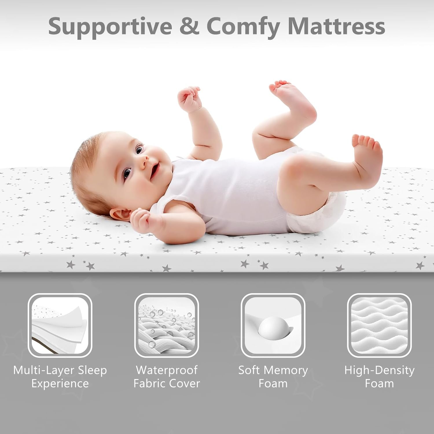 【Comfortable Mattress】 – The crib’s mattress is made of memory foam and high-density foam, offering a cozy sleeping space for your baby. The sheet is waterproof and easy to clean(Machine-washable), making it easy to maintain a fresh and hygienic sleeping surface for your little one.