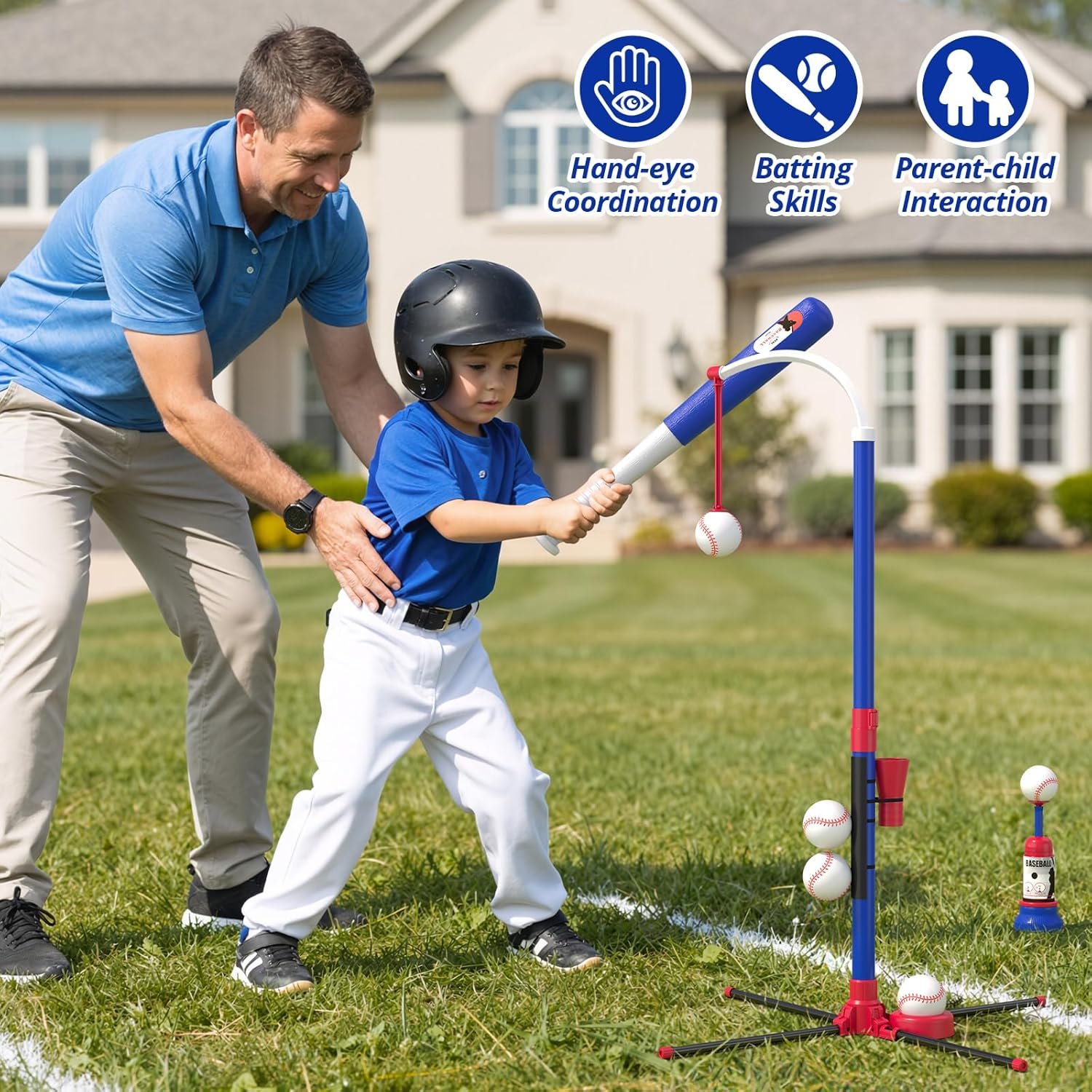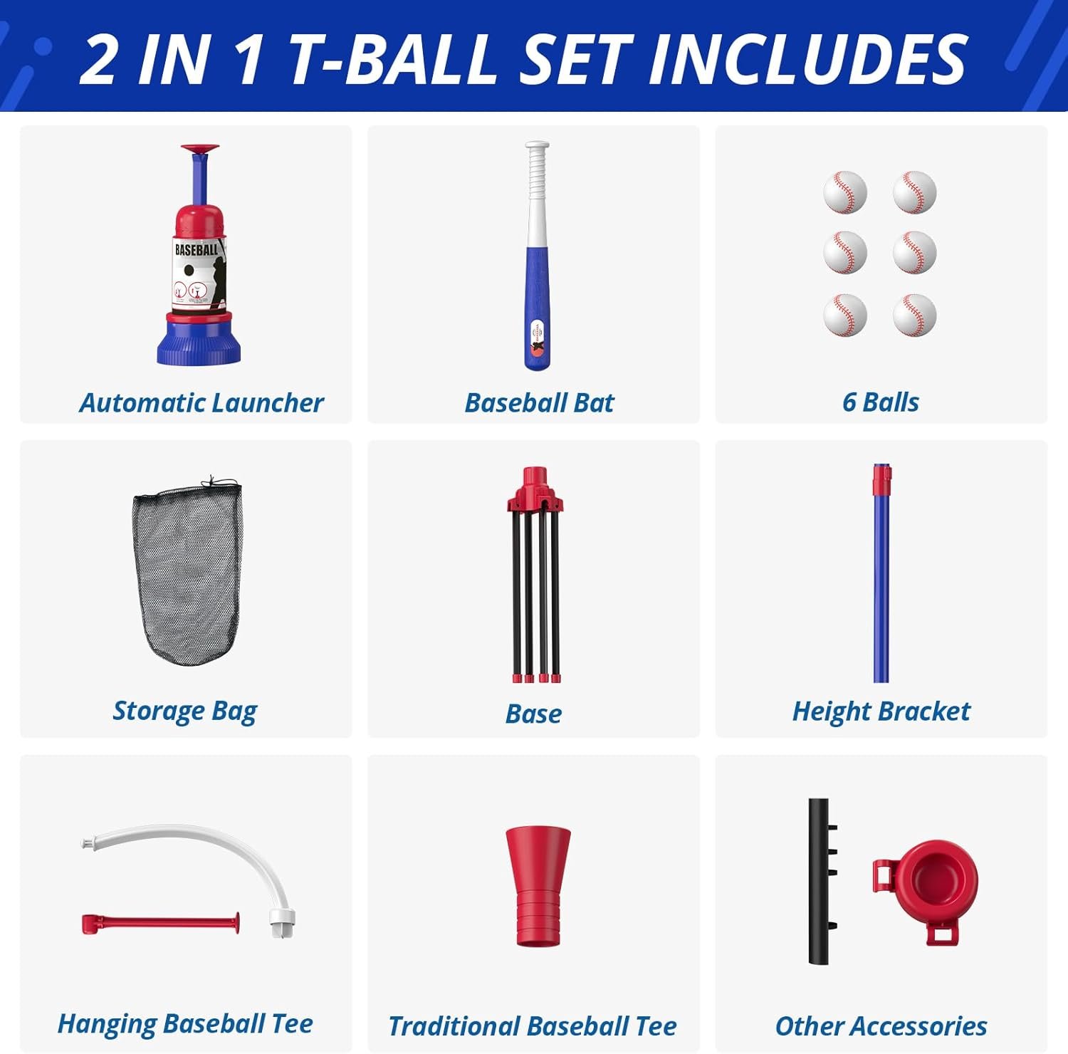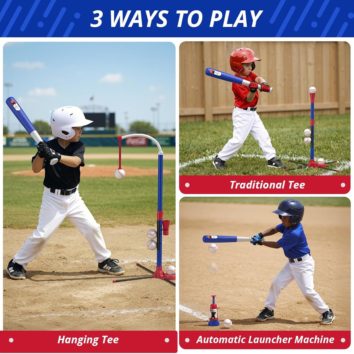 3-in-1 Baseball Set for Kids 3-5 – Tee Ball Stand, Hanging Tee, Ball Launcher and 6 Softballs – Adjustable Height, Indoor/Outdoor Sport Gifts for Boys Girls, Blue