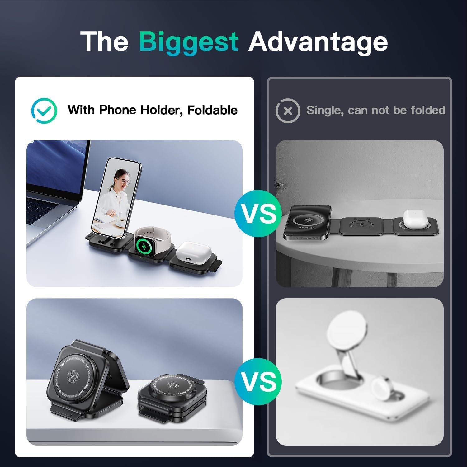 Else: This is the only wireless charging station on the market that has a stand and is foldable for travel! Let me introduce to you the two feature of wireless charging station: the first is that our 3 in 1 wireless charging station stand has more functional designs at the same price, the second is the self-developed wireless charging station
