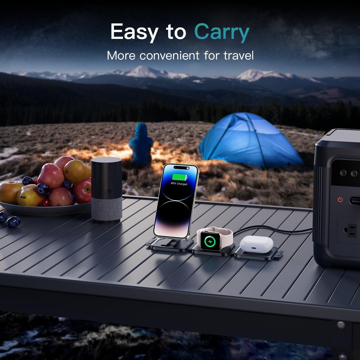 Customers appreciate the charging station’s compact design that folds into a small case for travel, and its ability to charge multiple devices quickly. Moreover, the product works well on planes and features a sturdy phone stand, while being easy to set up and use. Additionally, customers like the included carrying case for protection during travel, and one customer notes that all devices can be charged simultaneously.