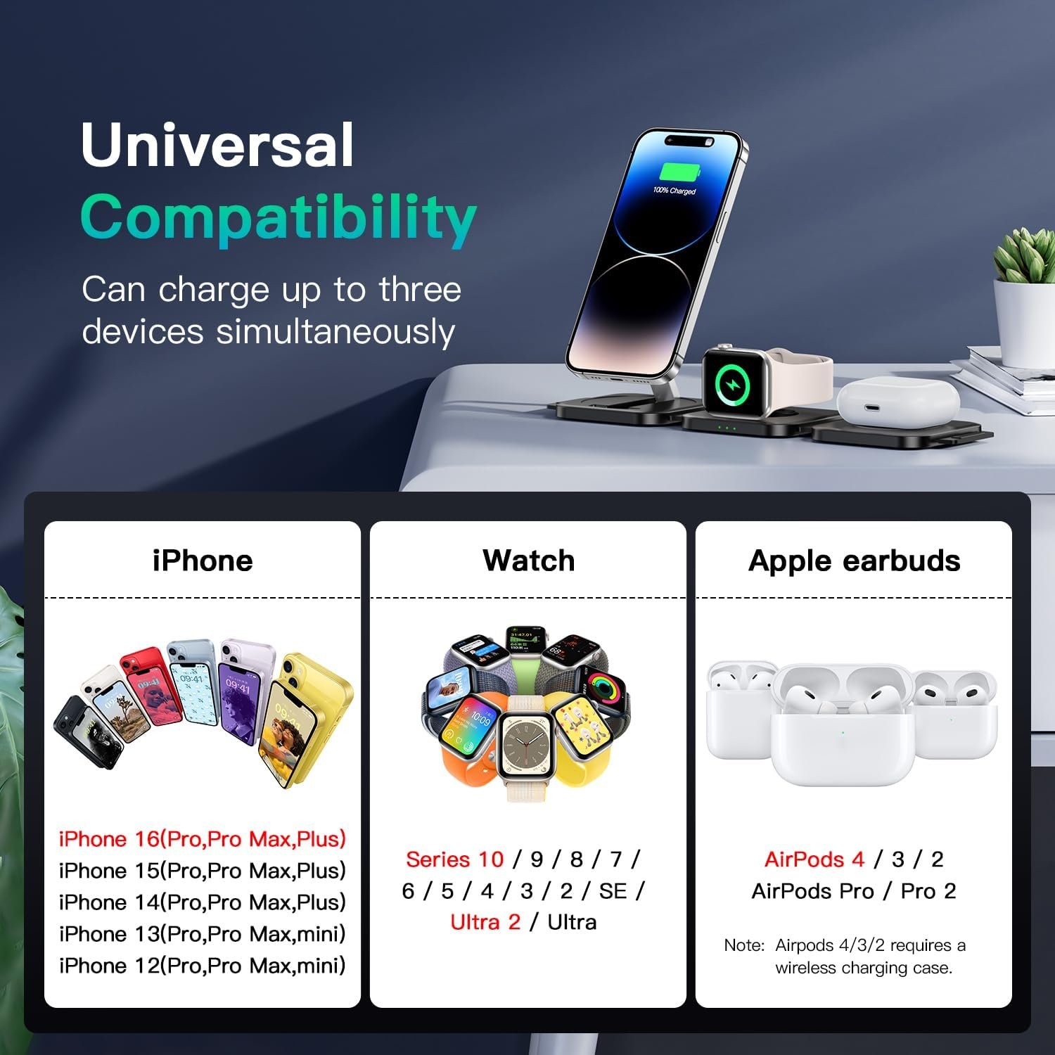 3 in 1 charging station won’t work on Android devices like Samsung, but will be friendly for Apple devices: iPhone 12-16 series, Apple Watch Series 10 to 2/SE/Ultra/Ultra 2 and AirPods 4/3/2/Pro/Pro 2.