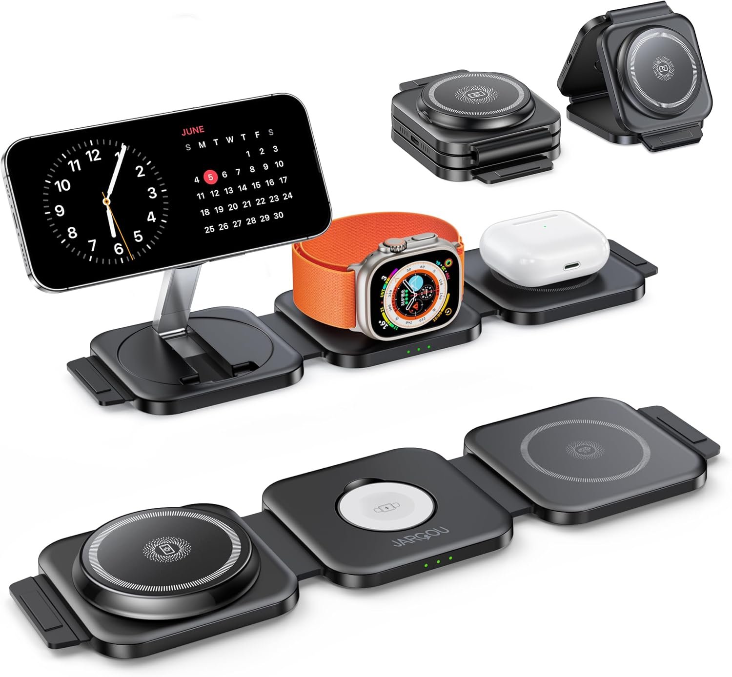 What is: It’s a foldable, small, travelable, travel charger station! JARGOU charging station can charge for iPhone, for Apple watch, and for AirPods at the same time, charger station is simply a little helper to keep the desktop tidy! Exclusively designed for Apple fans
