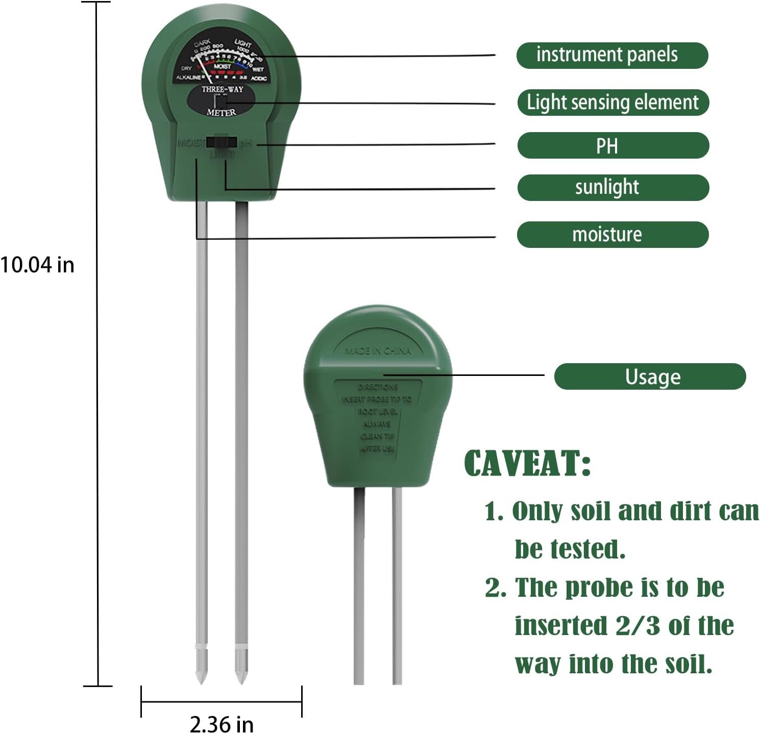 3-in-1 Soil pH Meter – Moisture, Light, and pH Tester for Garden, Lawn, Farm, Indoor & Outdoor Plant Care, Green