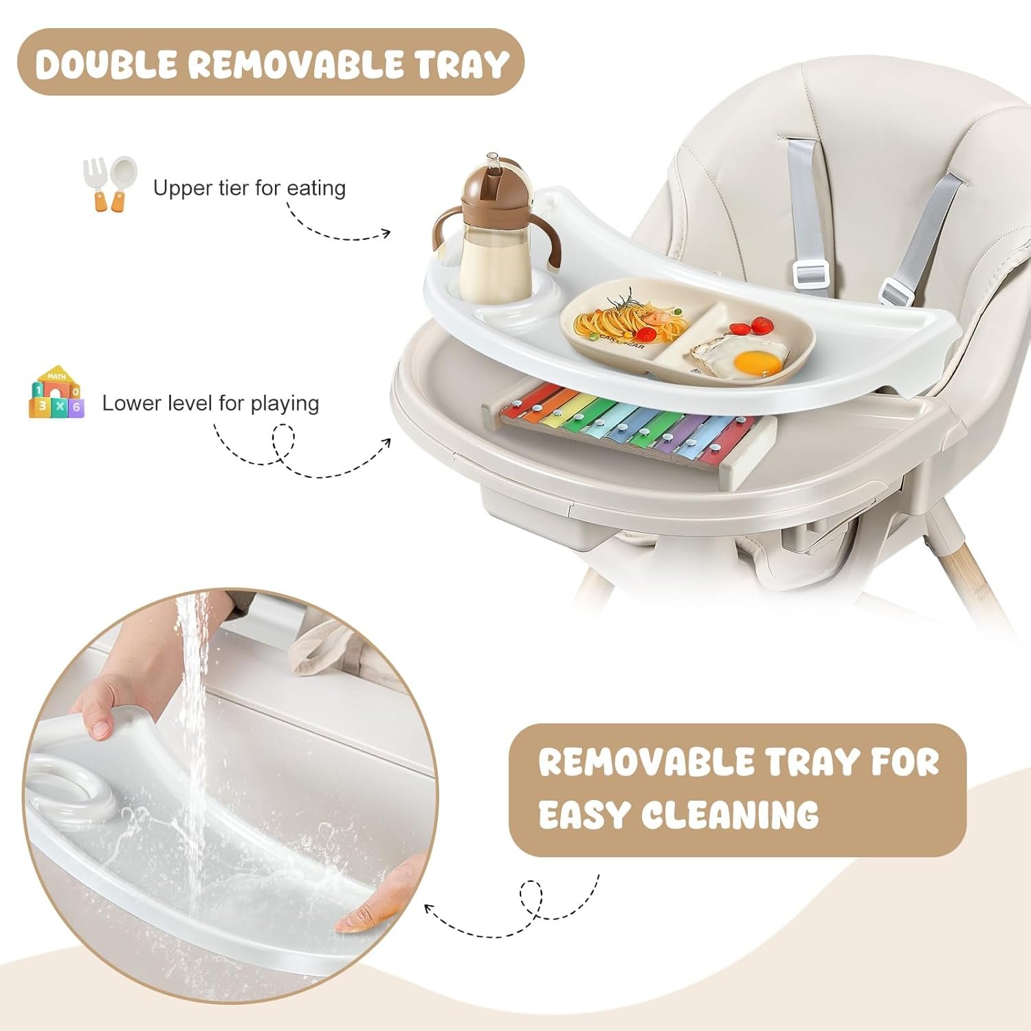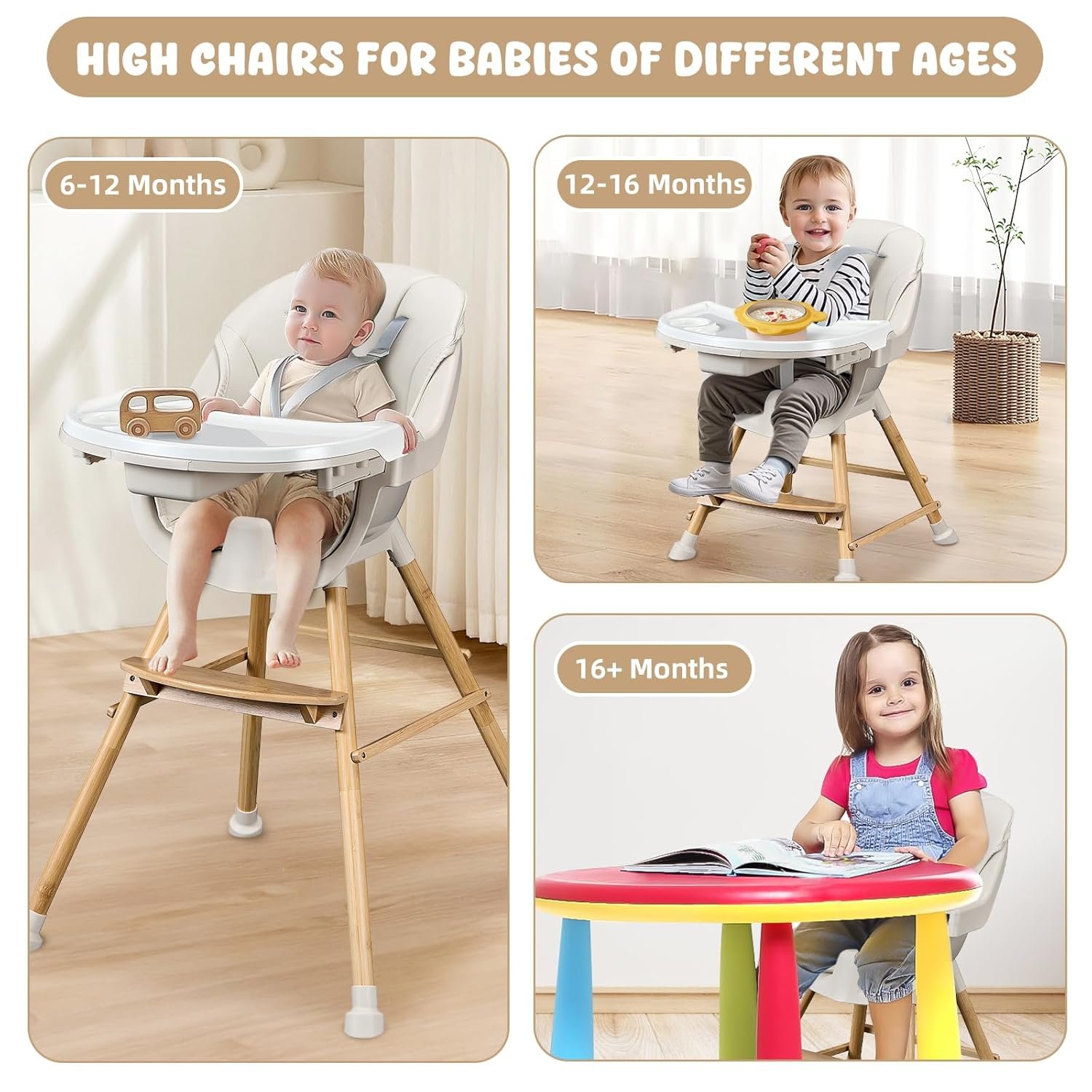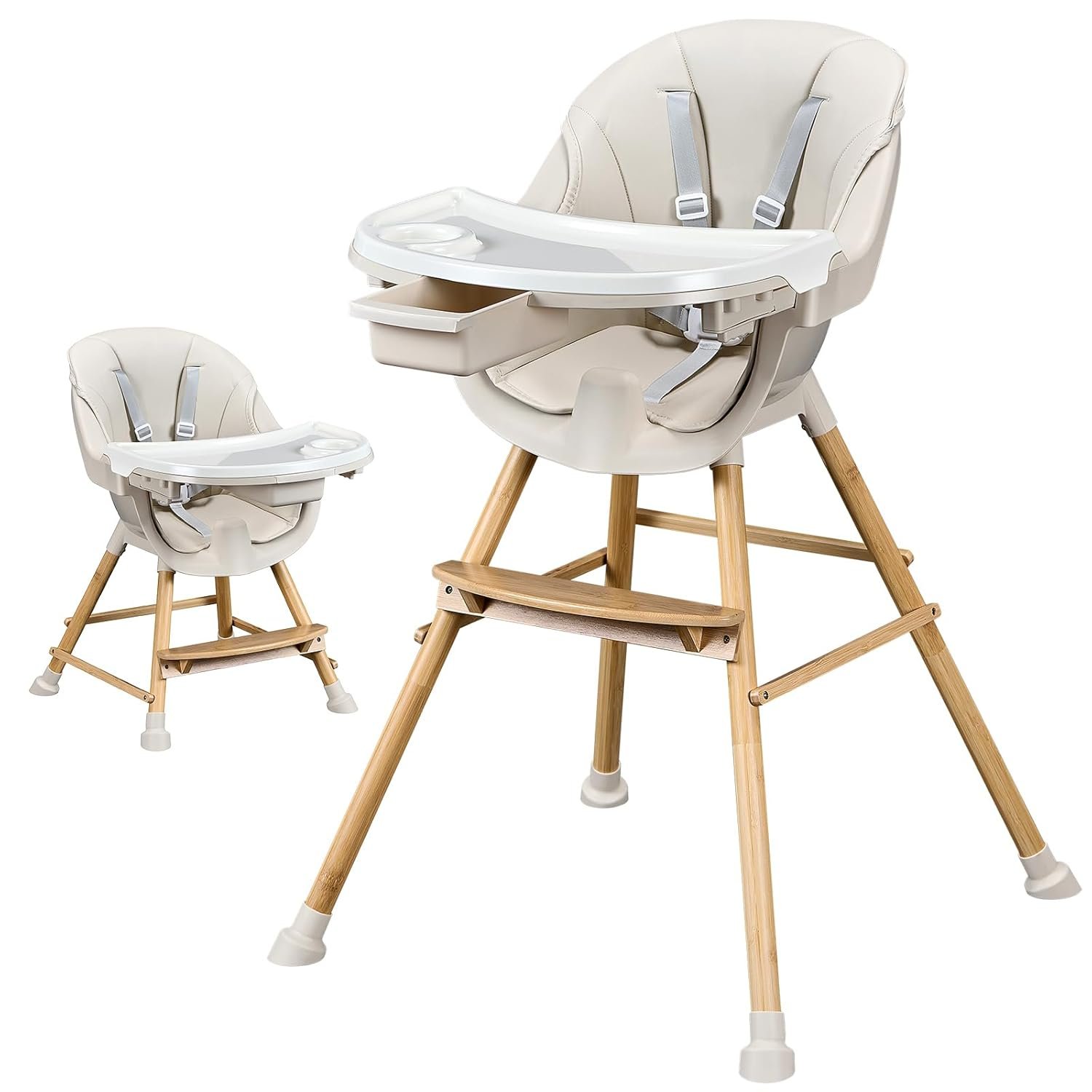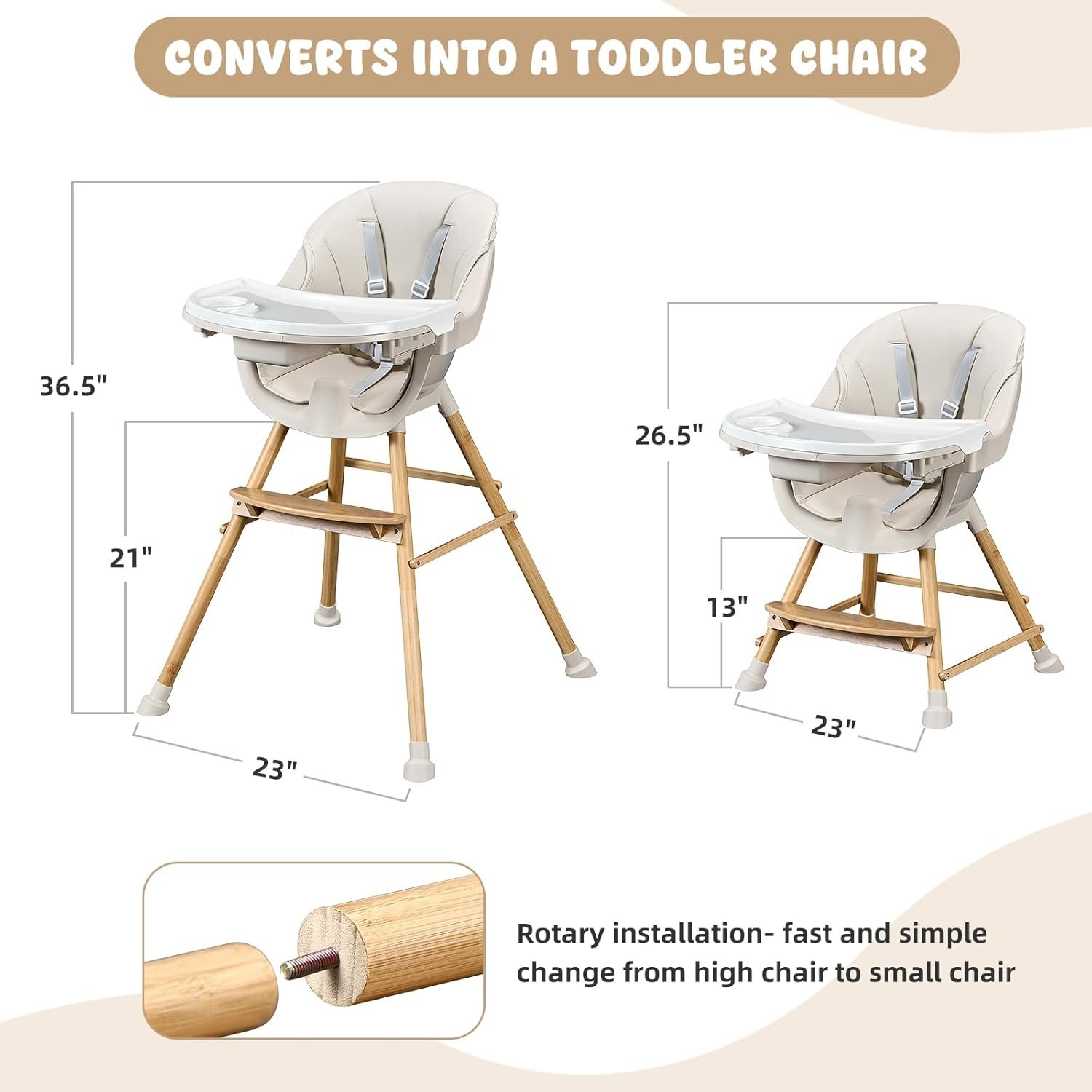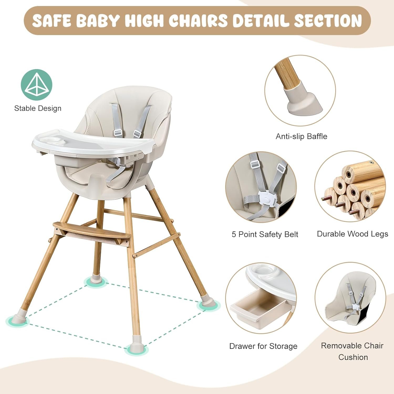 Material Safety: Our baby high chairs are made of smooth solid wood and BPA-free plastic that won’t harm your baby’s health. The smooth seat wrapped in leather cushions will not harm your child’s delicate skin. All thoughtful designs add comfort and durability for your little one.