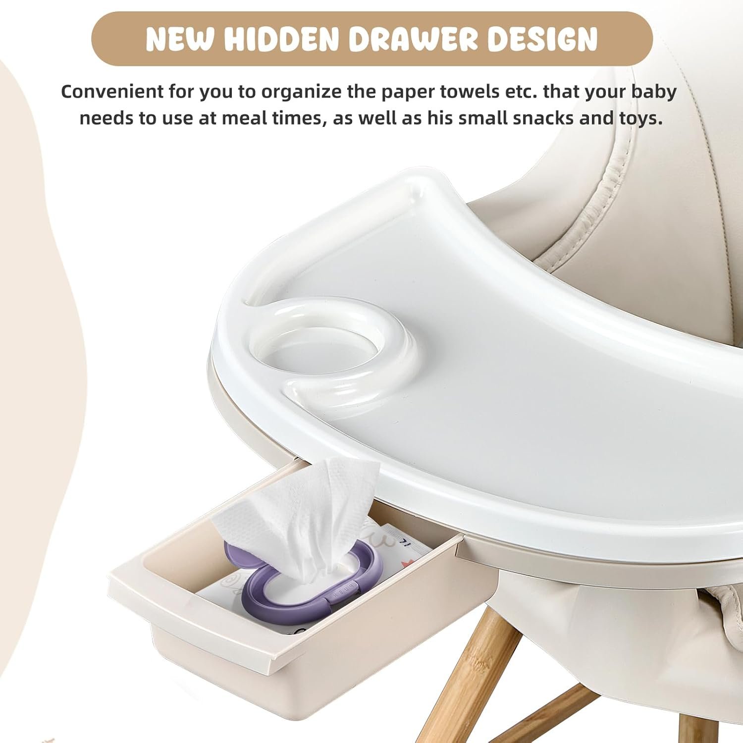 The baby high chair has a pyramid structure, ensuring your child’s safety and comfort is our top priority to ensure your baby’s safety during mealtime.Our baby high chairs are made of smooth solid wood and BPA-free plastic that won’t harm your baby’s health. the bottom tray of the tray has a built-in drawer, which can be convenient for you to store your child’s napkins, cutlery box snacks, etc. that you need during the meal.
