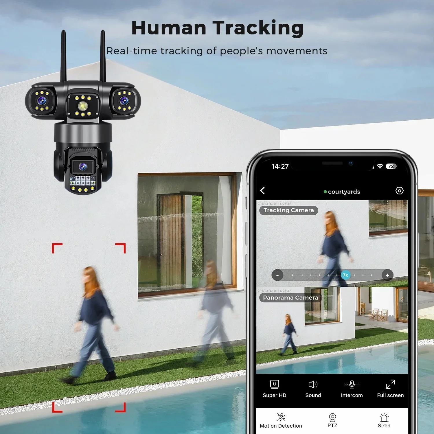 Quickly finds human targets and immediately sends a notification to your phone, letting you see what happens anywhere. It only detects the human shape and will not trigger falsely for objects such as cars and trees.