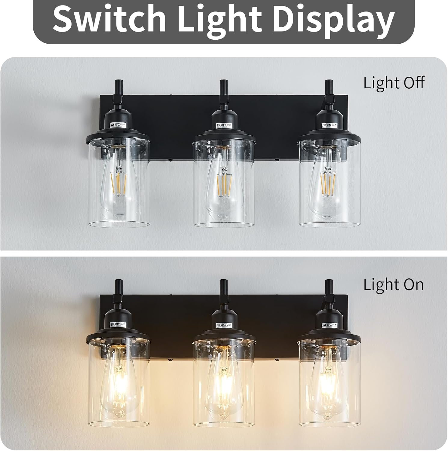 【Bulb Type】 The farmhouse vanity lights for bathroom works well with any E26 medium base bulb. Compatible with 60 watt or lower LED, CFL, halogen lamp,Edison bulb or incandescent bulb. Dimmable is fully supported by using dimmable bulbs and dimmer switch.(Bulbs/Switch Not Included).