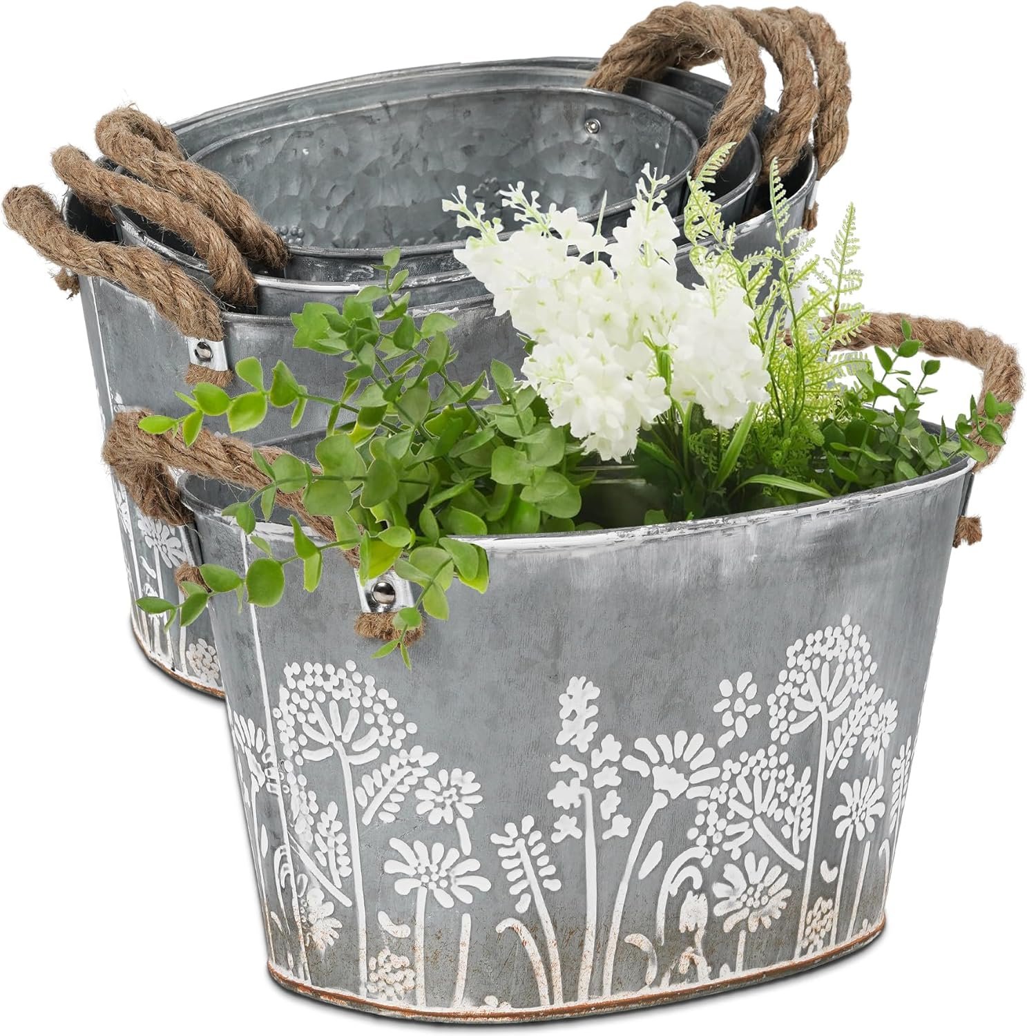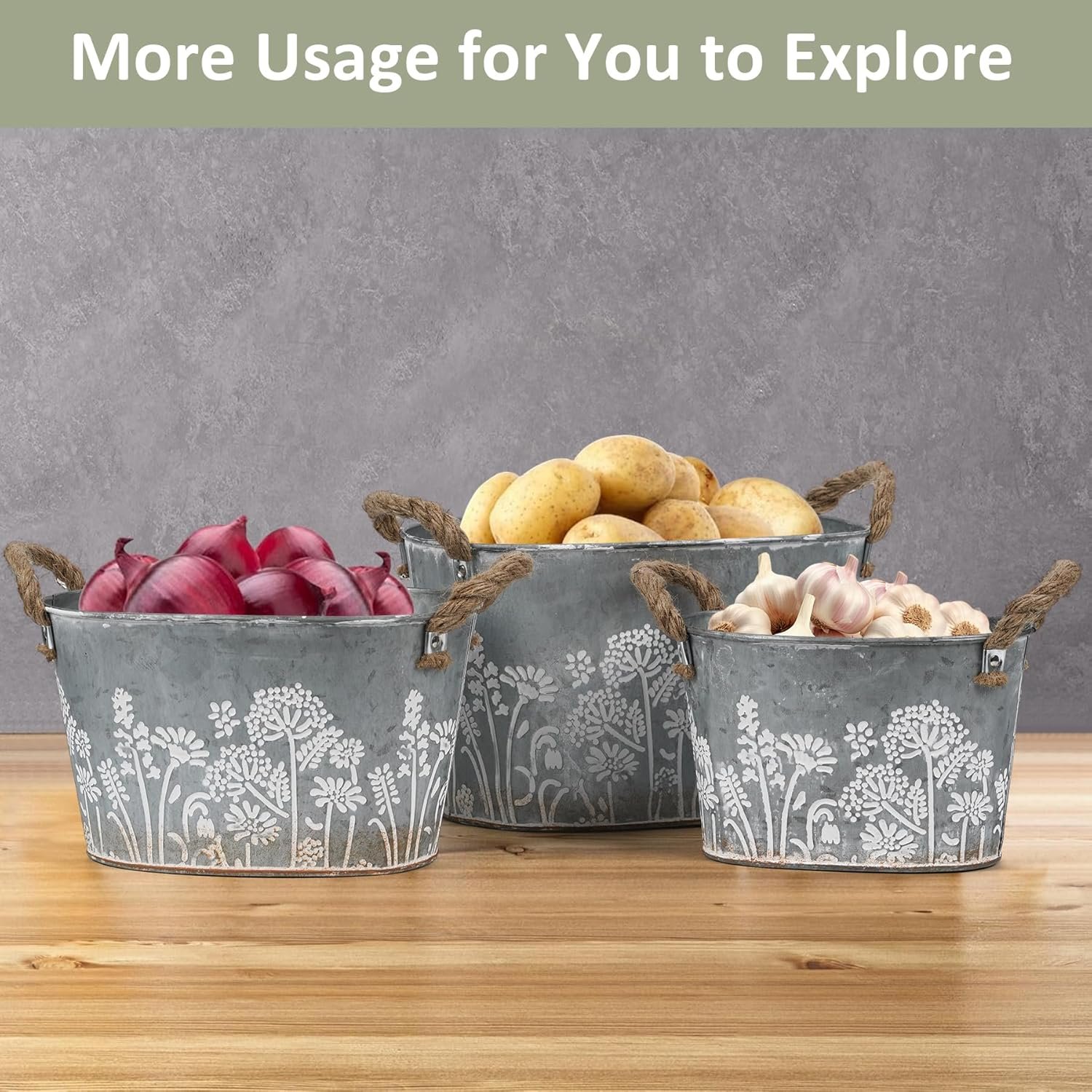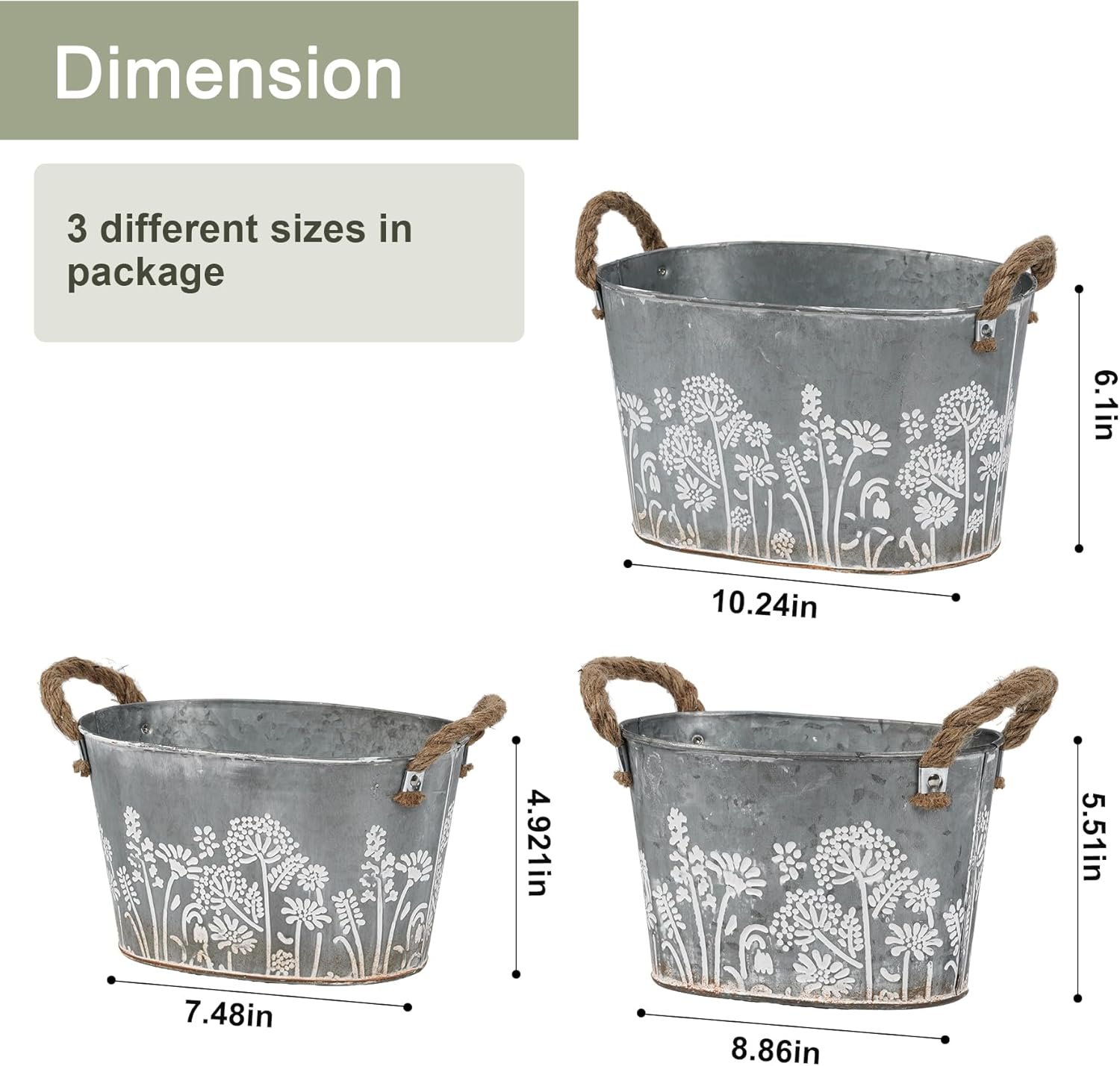 3 Pack Oval Galvanized Planter Tubs, Garden Metal Rustic Flower Pots for Outdoors, Rustproof Tin Bucket Vintage Plant Pot, Large Shallow Flower Bucket with Handles