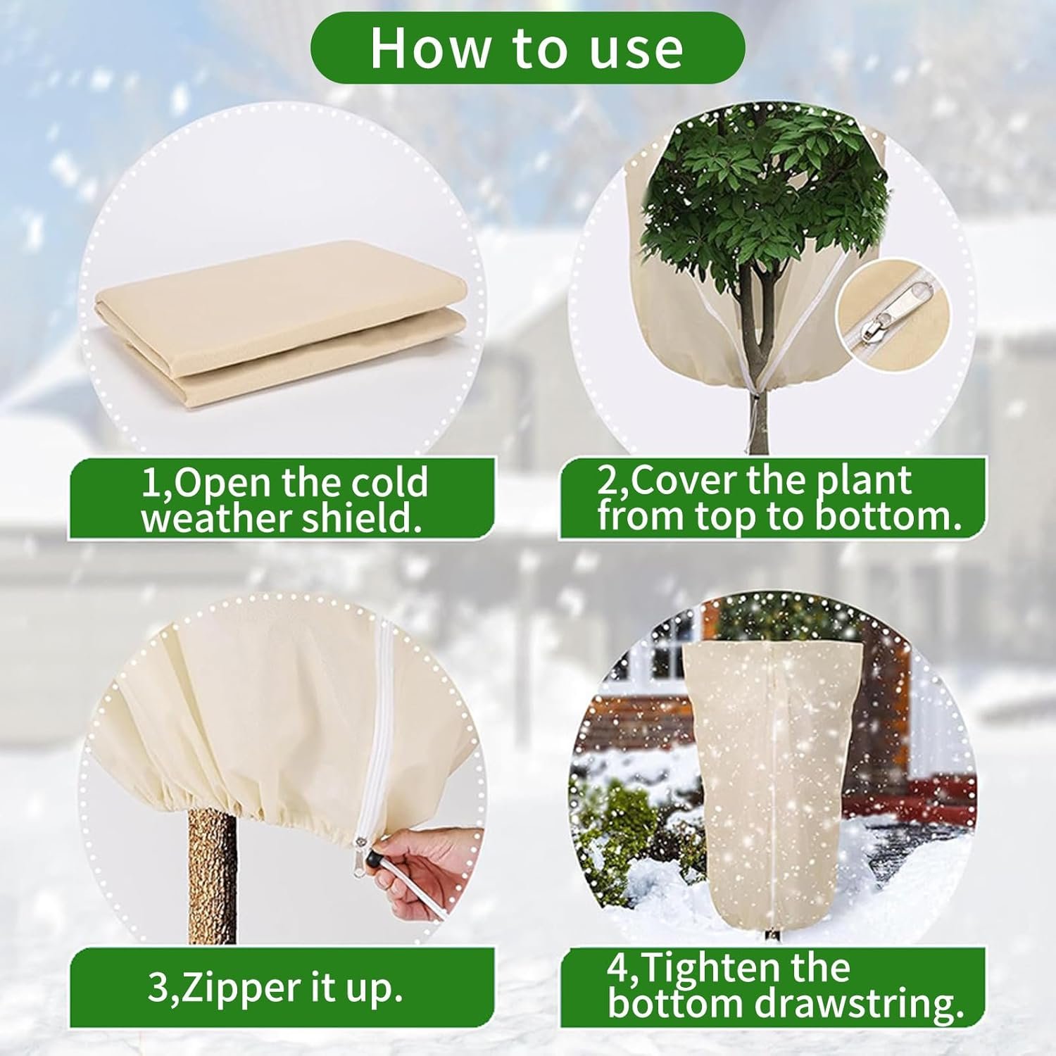 Our cold weather covers are designed with zippers and drawstrings. The zipper serves to make it easy for you to slip this cloth bag over the crown of your plant. The drawstring allows you to pull in the cloth bag to prevent it from being blown off by high winds and to enhance the warmth.