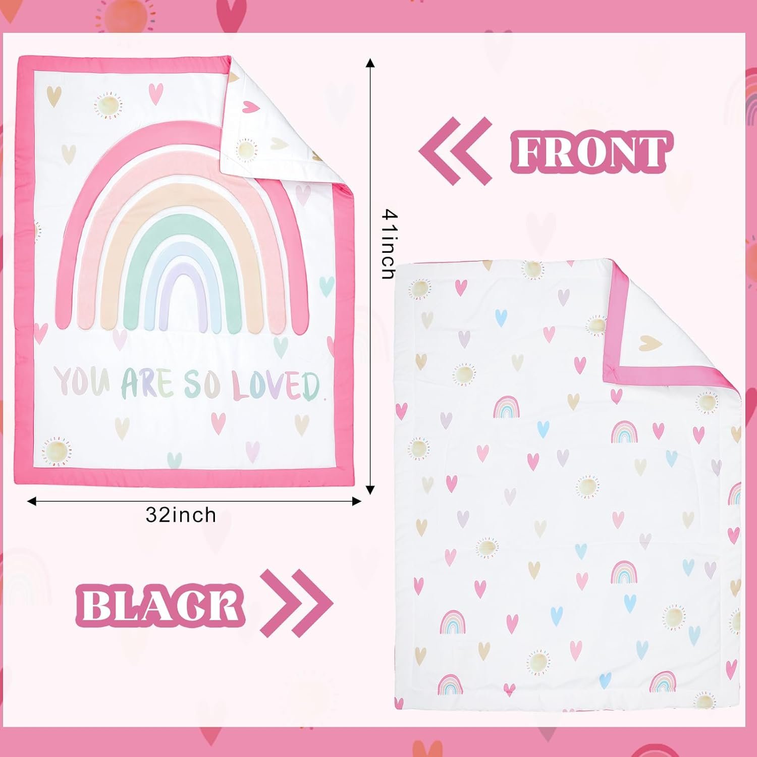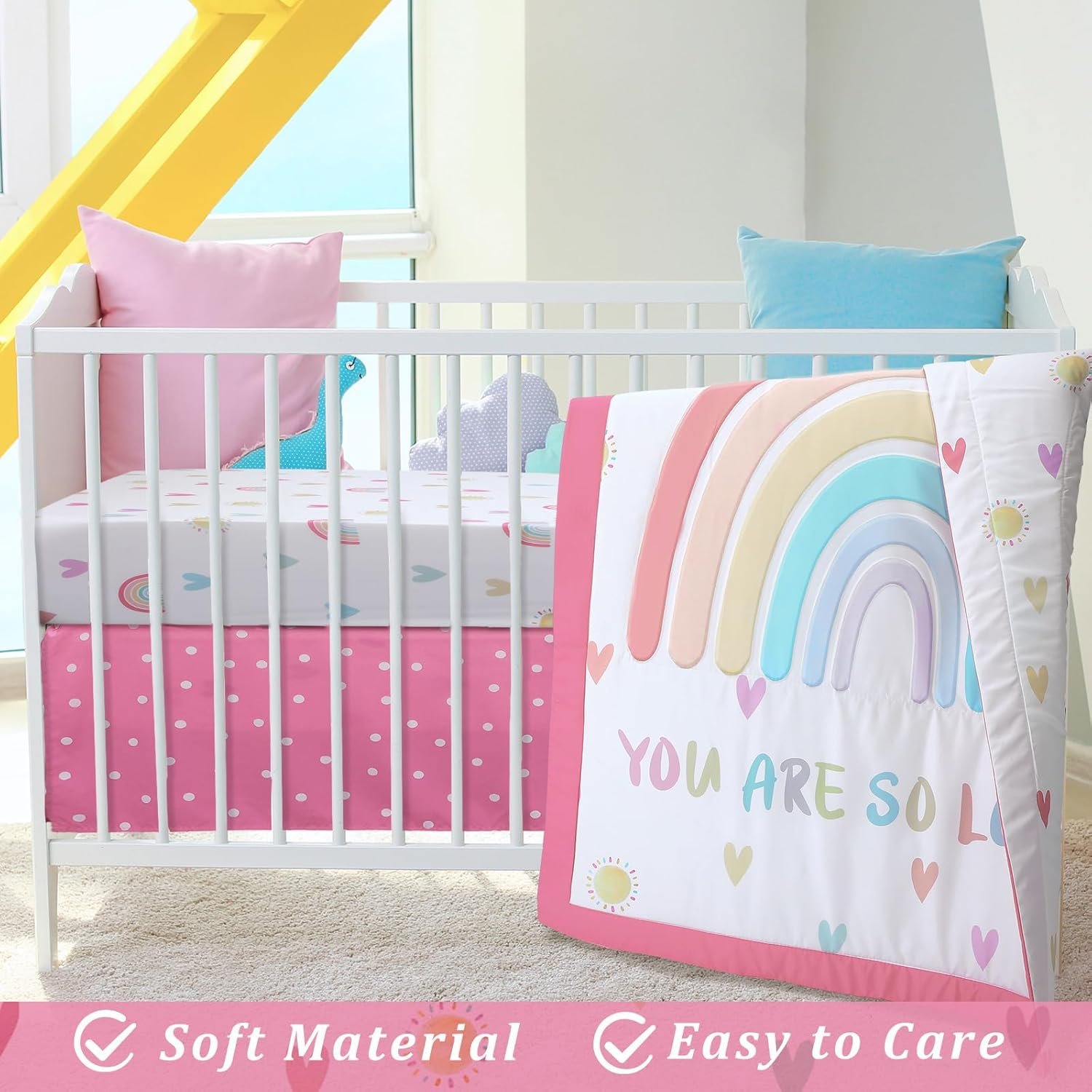 3 Piece Rainbow Boho Crib Bedding Set for Girls Inspirational Quote Pink Baby Crib Bedding Set Standard Size Nursery Bedding Includes Fitted Crib Sheet,Comforter, Crib Skirt