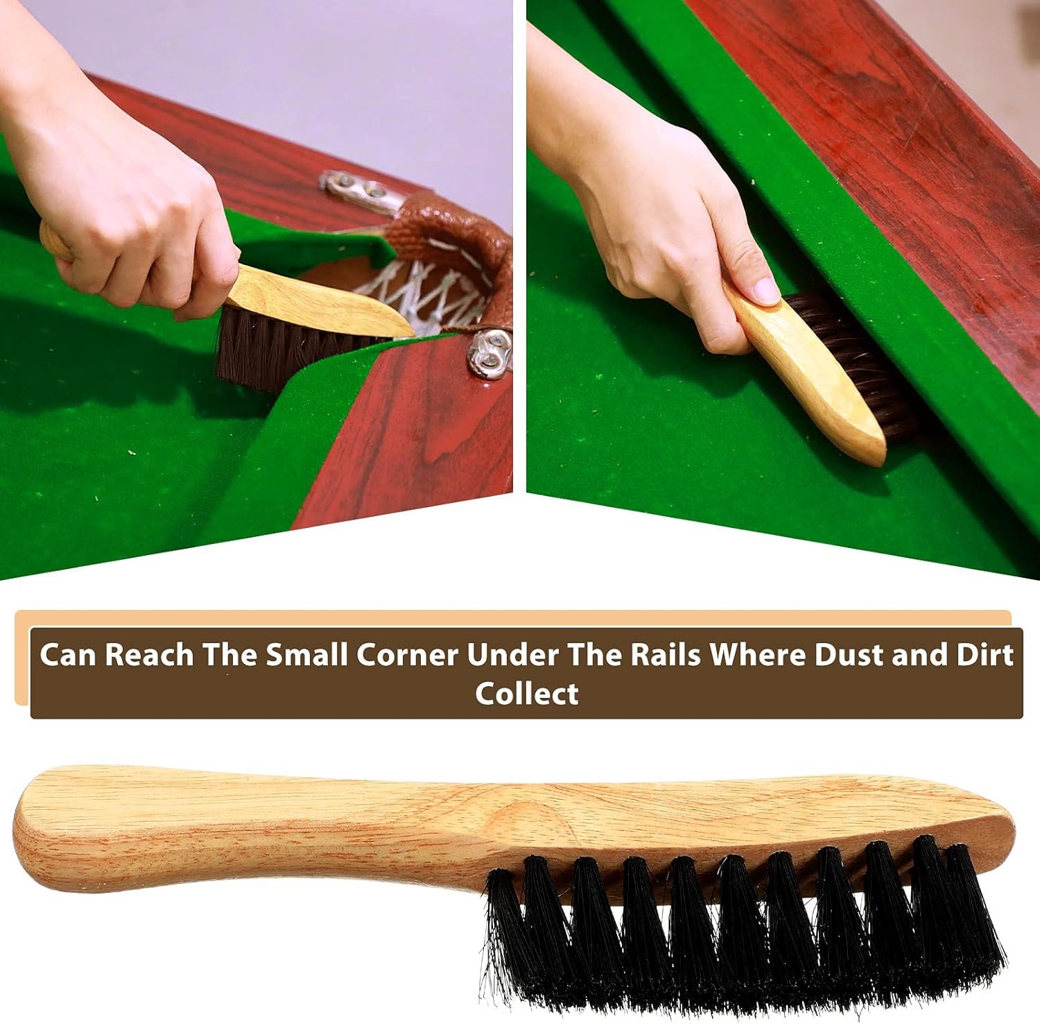 2 pieces practical brush: billiards pool table and rail brush work well to keep billiards pool table clean and won’t pill surface of the billiard, and the rail brush can reach the small corner under the rails where dust and dirt collect