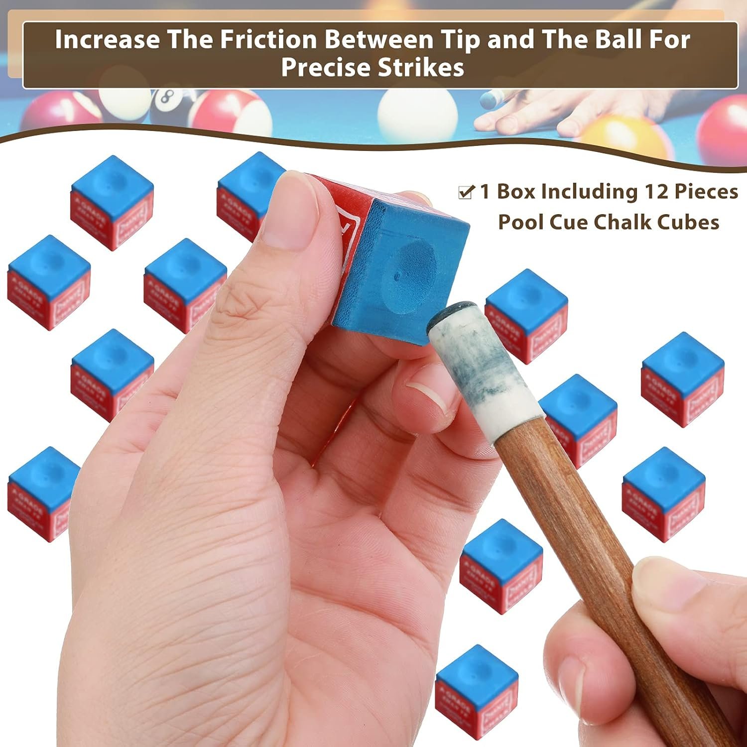 Billiard cue chalk: you can apply the billiard cue chalk to the tip of the stick, which can increase the friction between tip and the ball for precise strikes; It is essential billiards accessory for playing game, competitions or tournaments