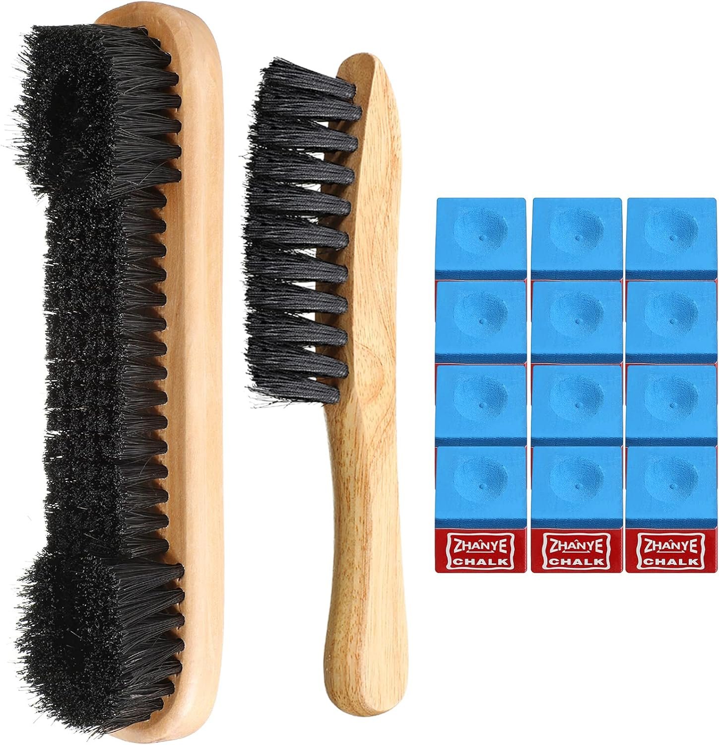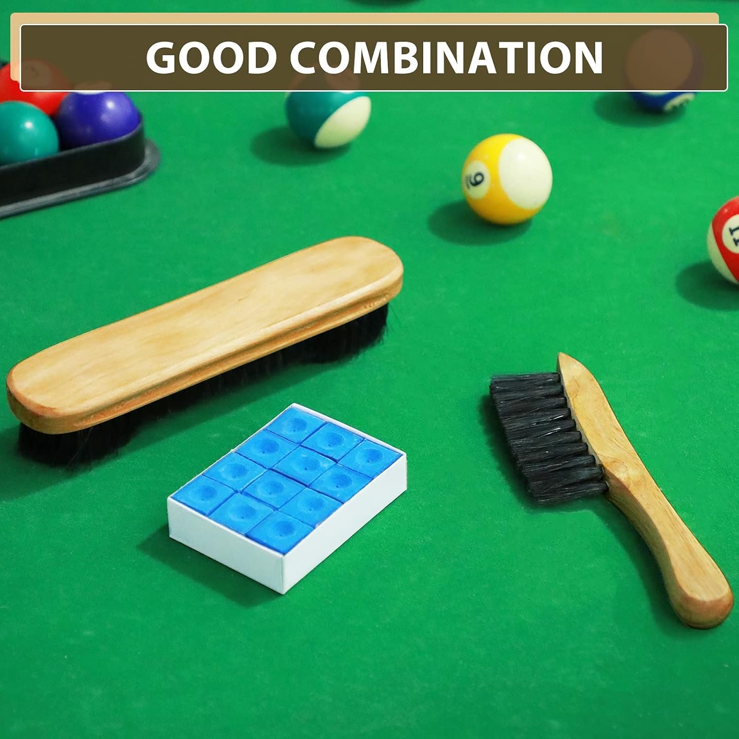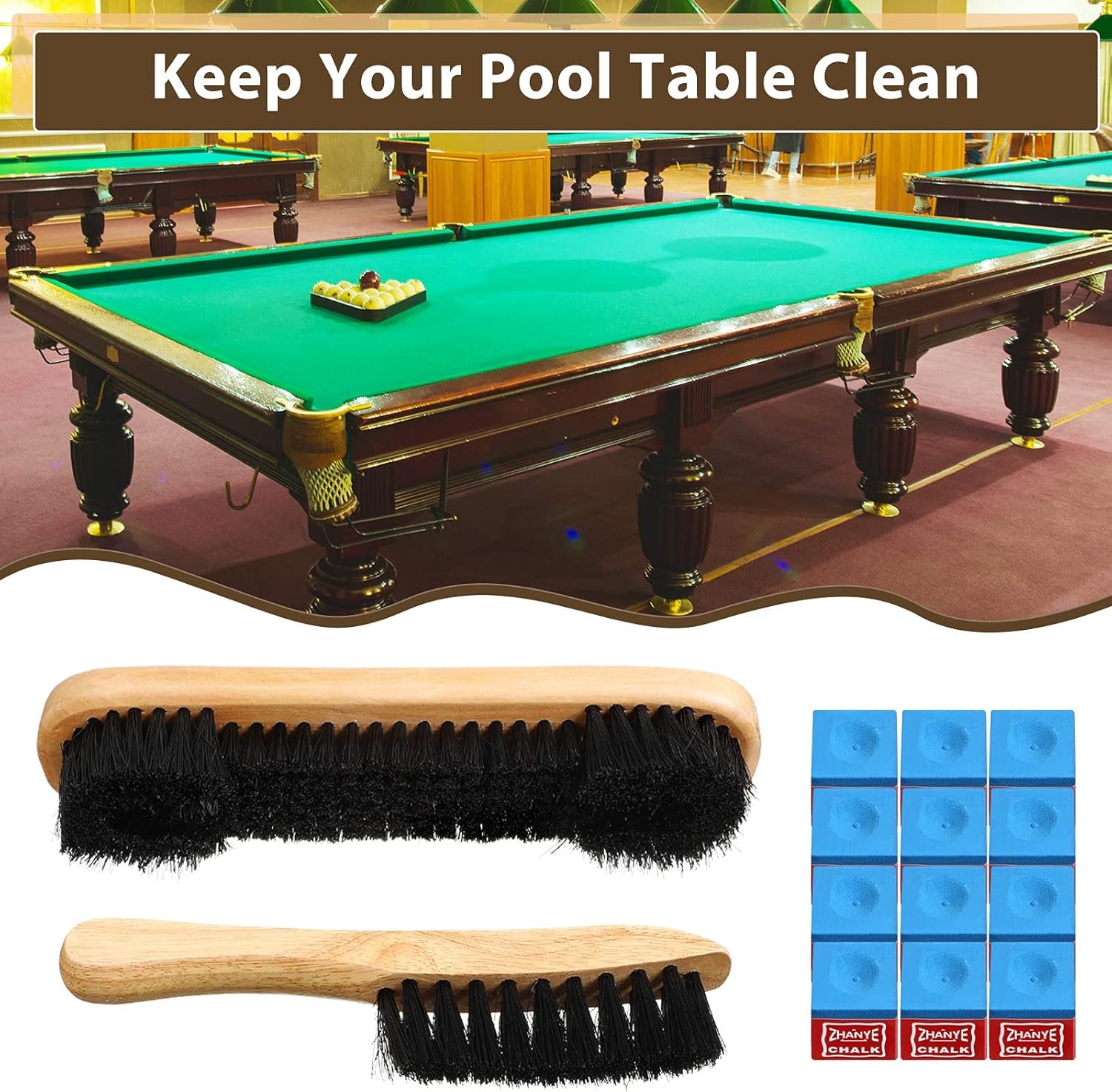 What you get: there are totally 14 pieces billiards pool table accessories, including 1 piece billiards pool table brush, 1 piece billiards rail brush for daily cleaning, and 1 box of chalks (12 pieces) for pool cues and billiards sticks tips