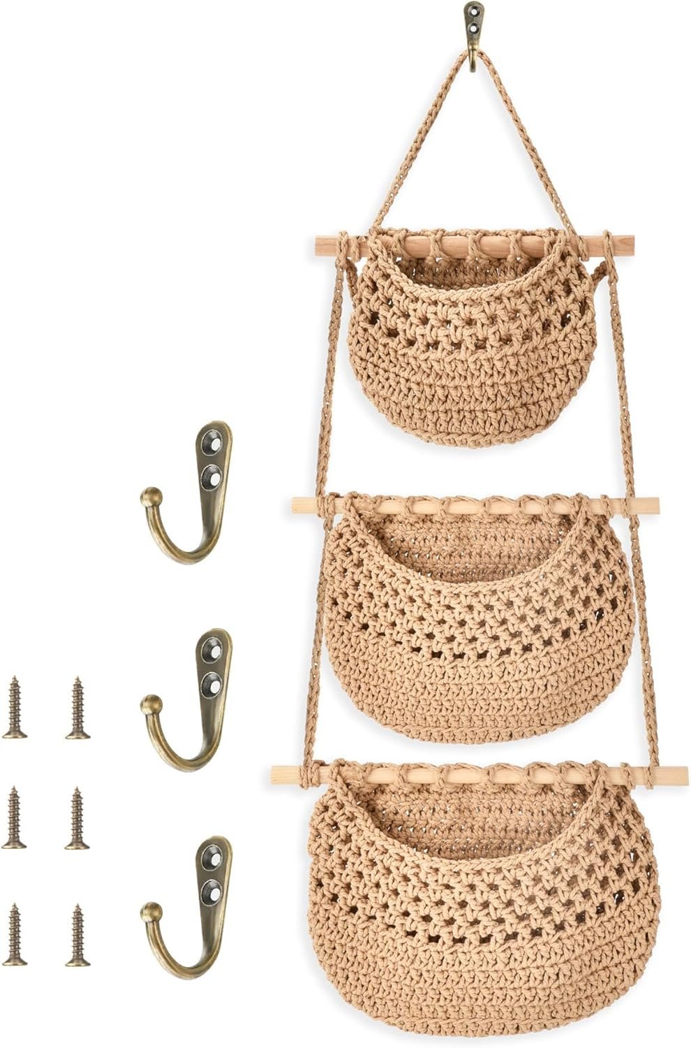 Hanging Fruit Basket, 3 Tier Woven Jute Wall Hanging Basket for OrganizingHanging Fruit Basket, 3 Tier Woven Jute Wall Hanging Basket for Organizing