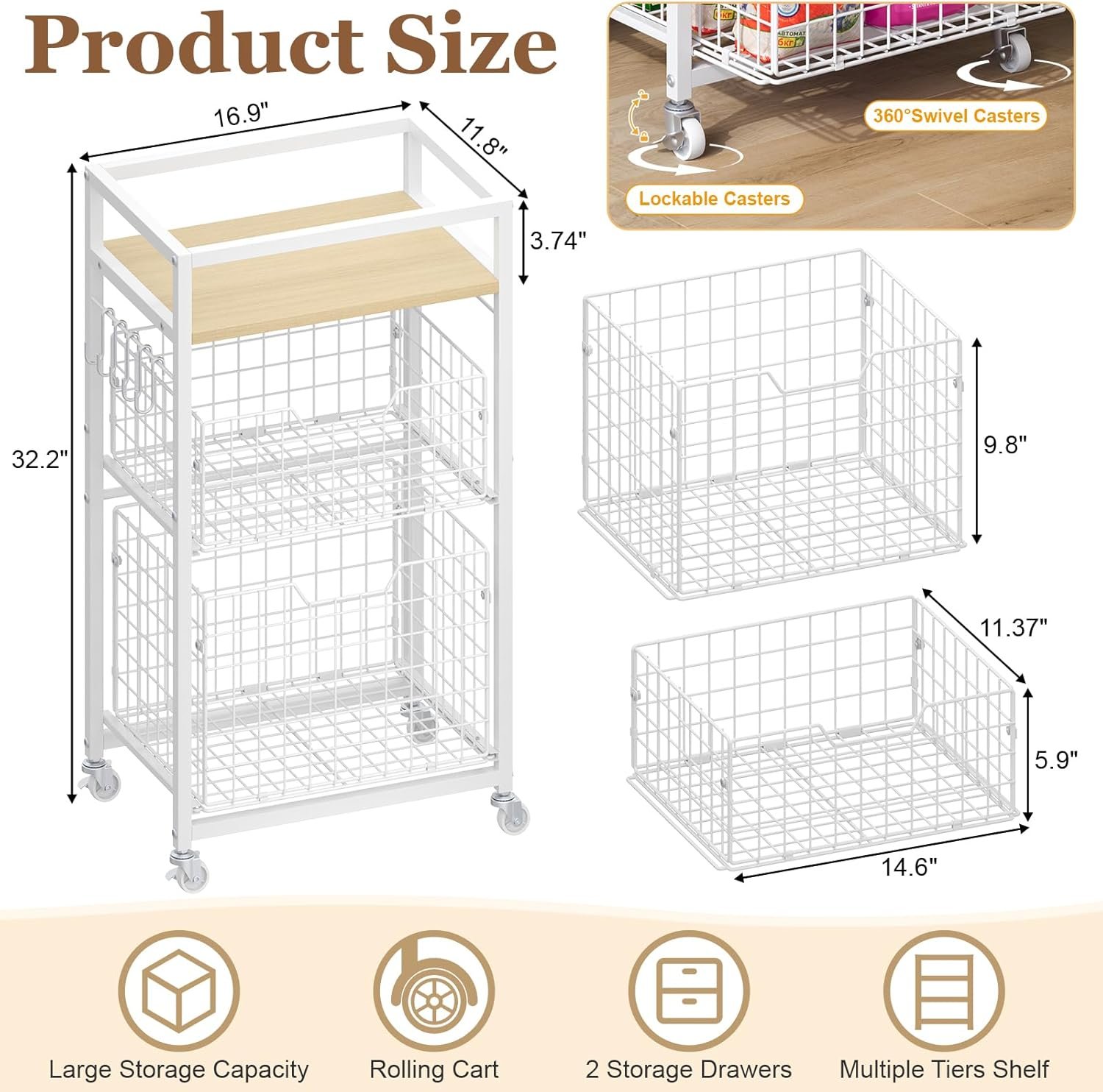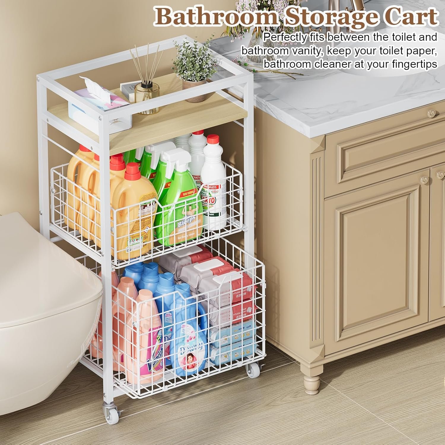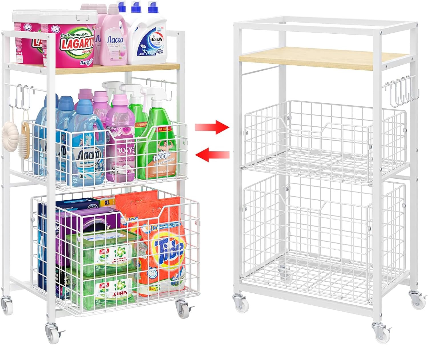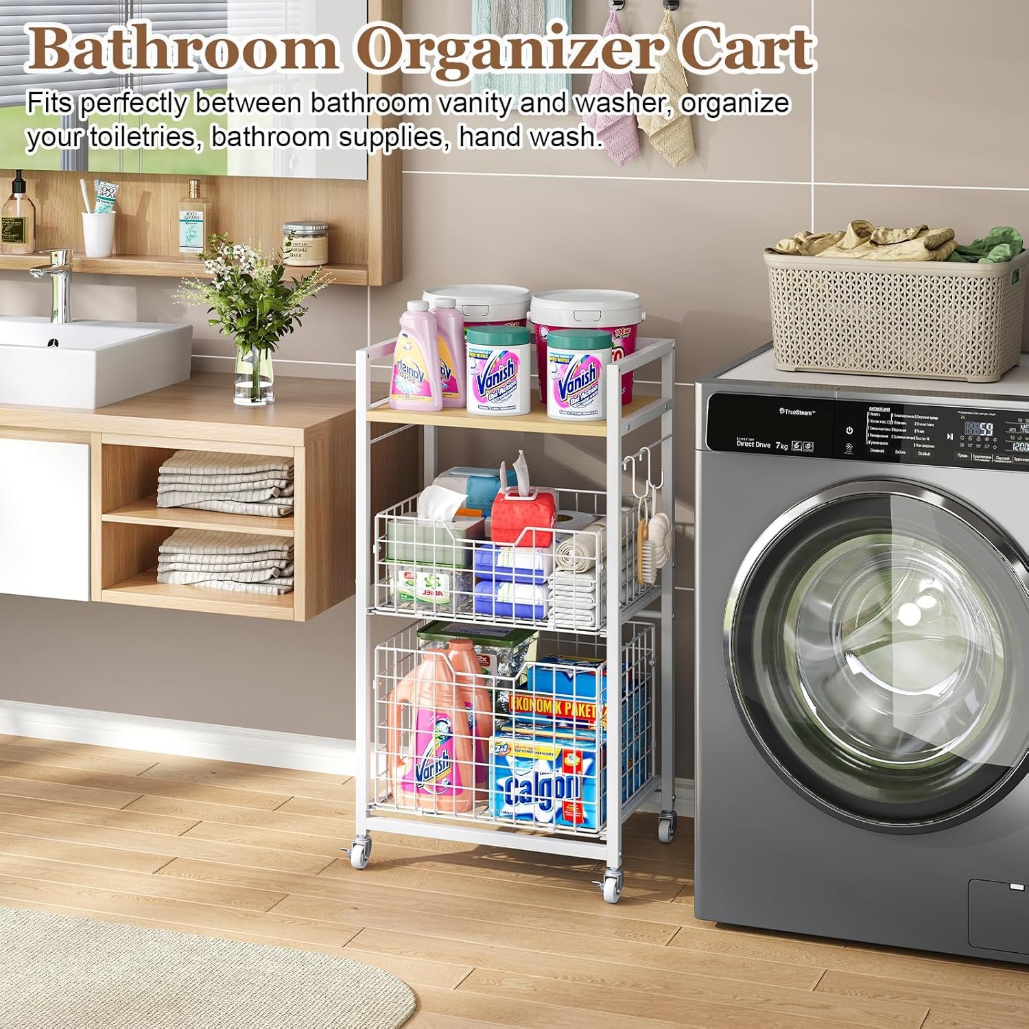 3 Tier Laundry Room Cart with Pull-Out Baskets, Utility Cart Rolling Storage Cart with Wheels Bathroom Organizers Storage Shelf with Wood Top Laundry Room Organization and Storage, White