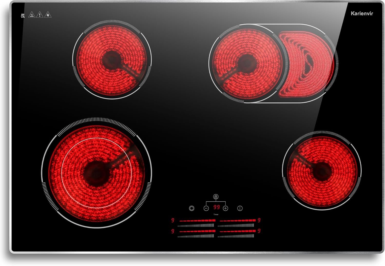 Double Ring Burner : 4 burners electric cooktop 30 inch design a double ring burner. The inner ring has a power of 1000W and can be used alone. When the inner and outer rings are turned on at the same time, the power is up to 2200W. The cooking area extends from 16.5cm to 27cm, which is suitable for a wide range of pot sizes, giving you more flexibility and versatility in your cooking.