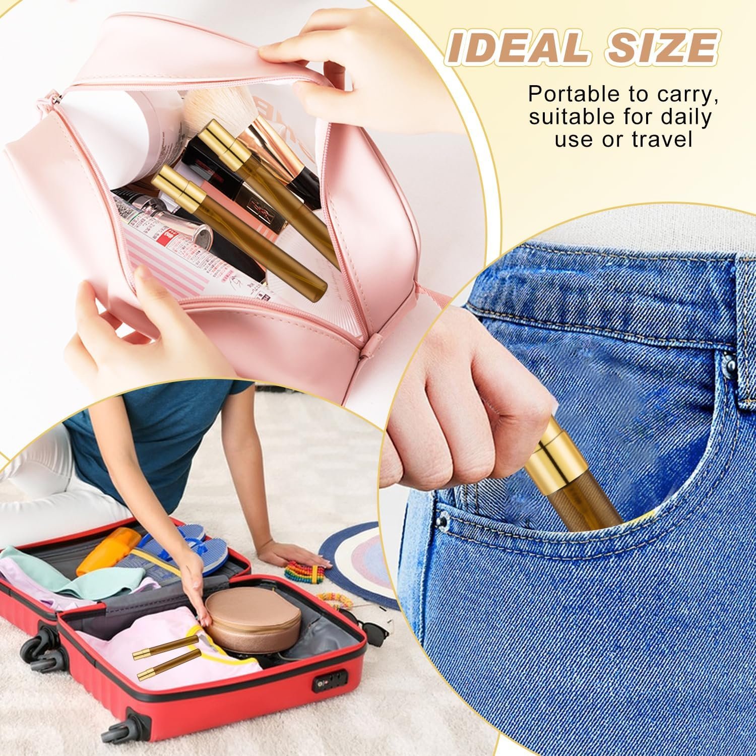 Portable to carry:our perfume spray bottle size is mini,3ml size:1.4cm*5.7cm;5ml size:1.4cm*7.4cm;10ml size:1.4cm*11.5cm,portable to carry and use,can be easily put into a pocket, wallet, purse or small bag,suitable for traveling or business trips