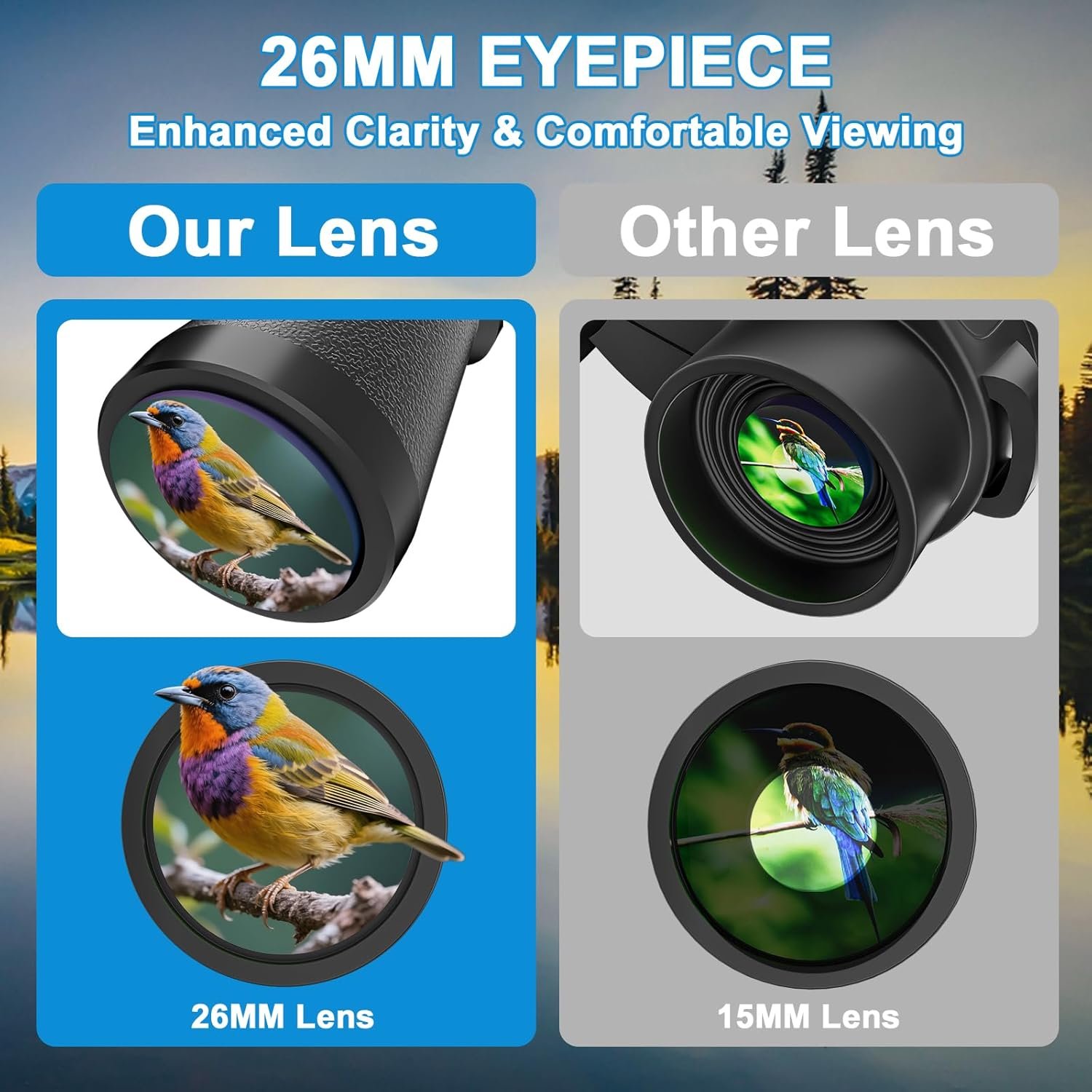 26mm Large Eyepiece – The 26mm wide eyepiece provides an immersive viewing experience with reduced eye strain. Paired with ergonomic rubber armor, these lightweight binoculars offer a secure, non-slip grip during extended use on safaris, cruises, or hikes.