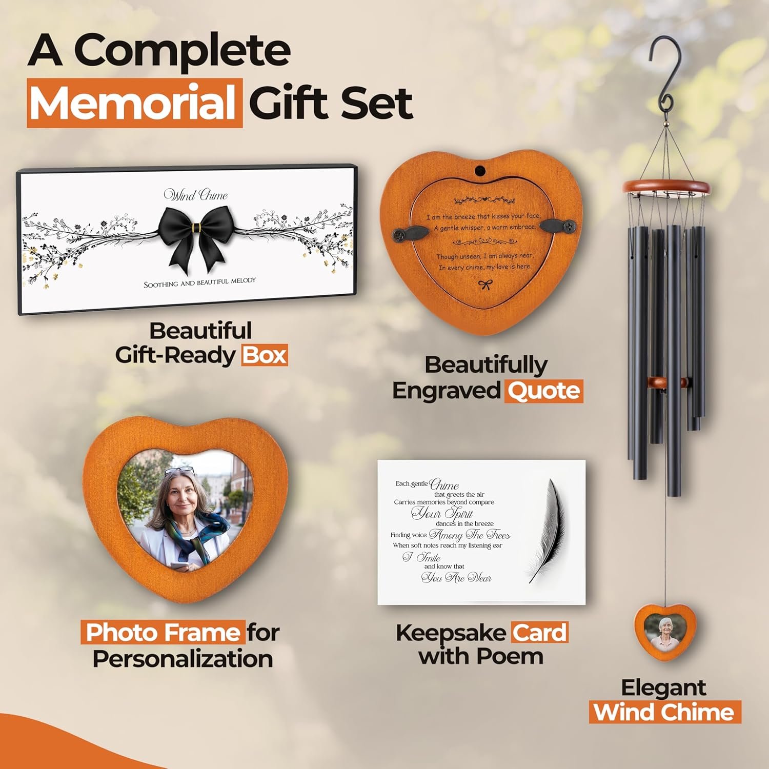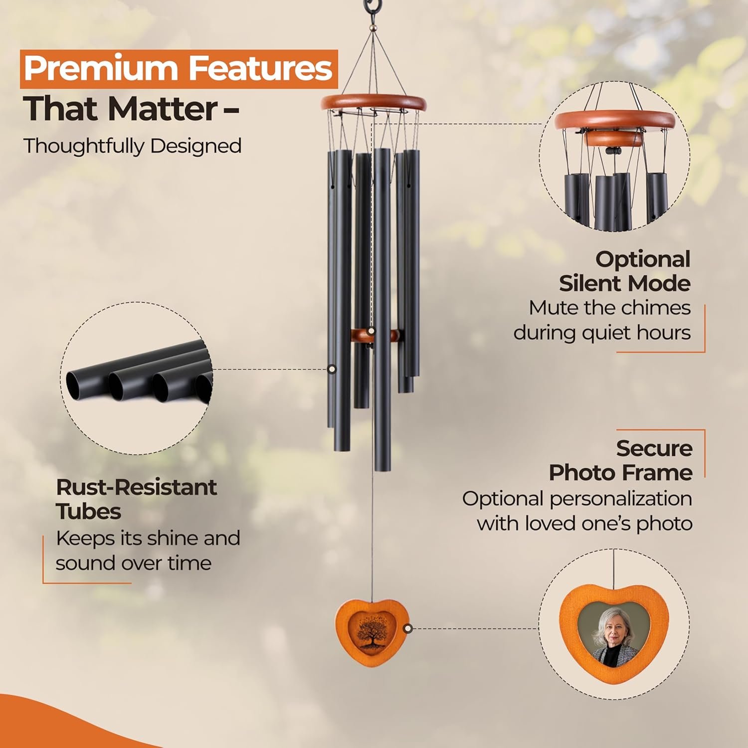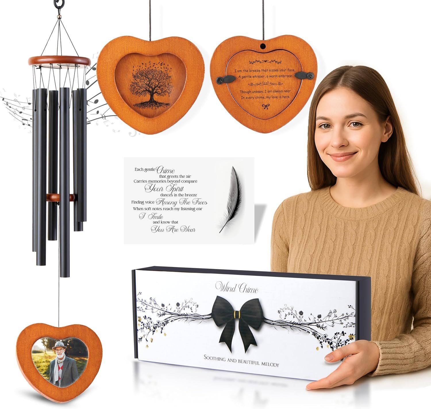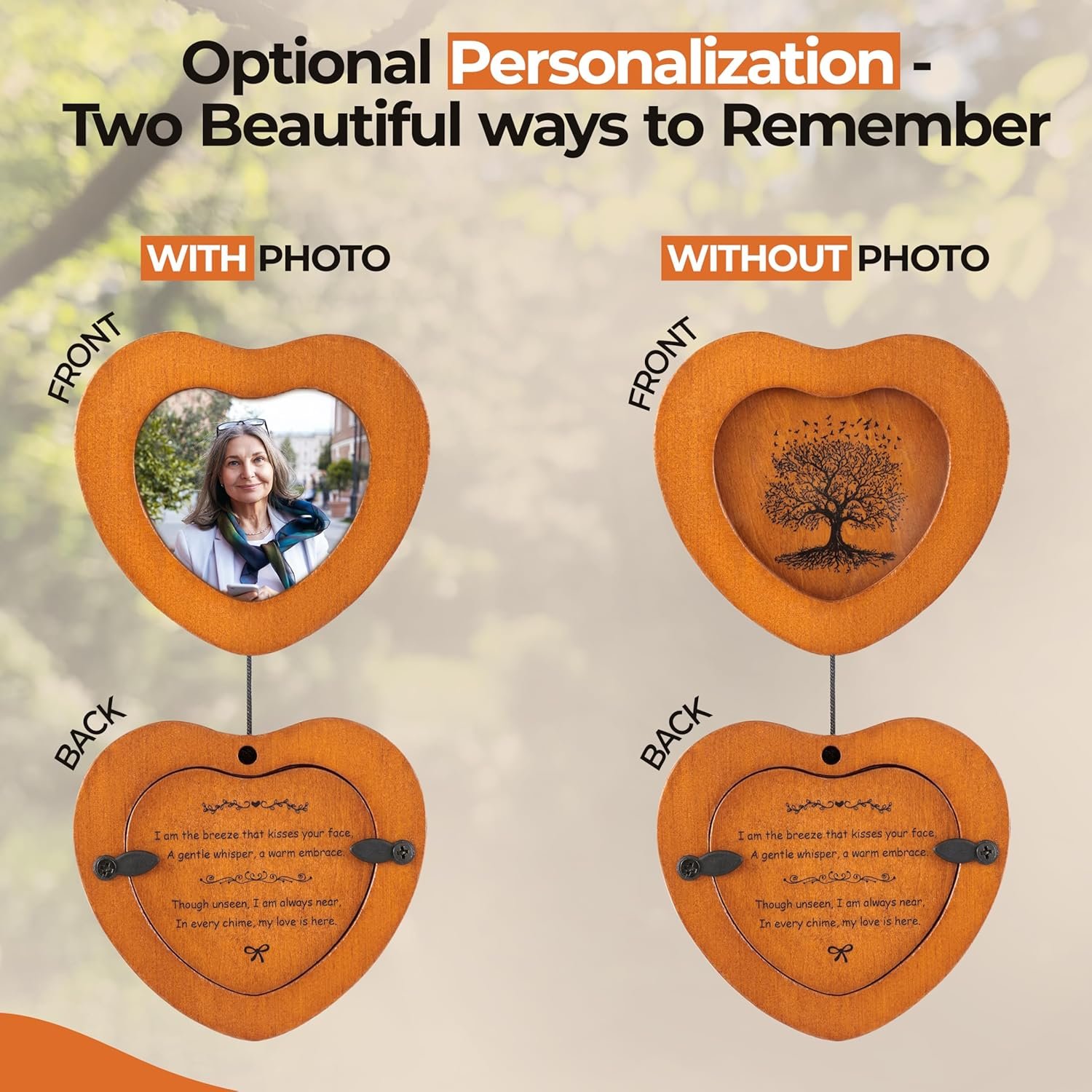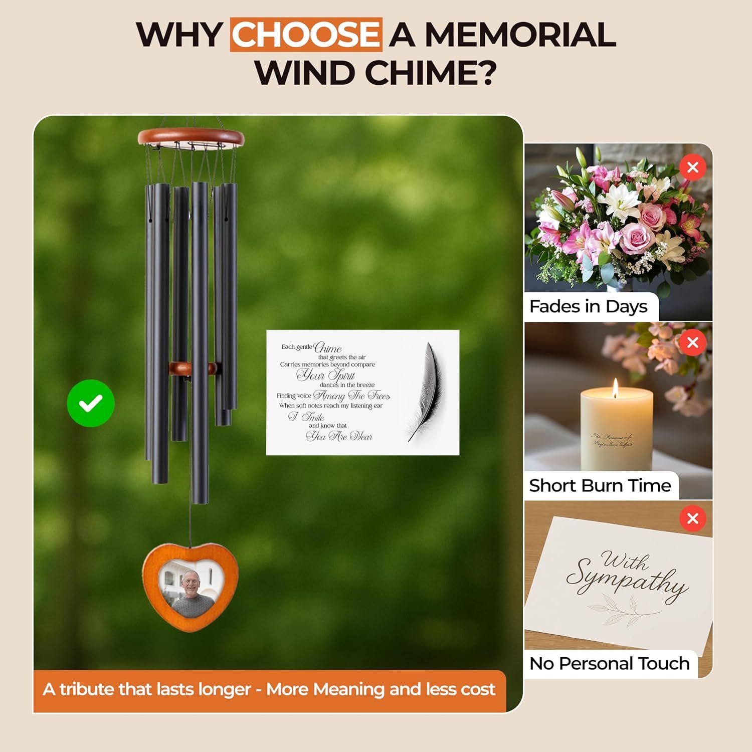 Unlike flowers, memorial candles cards or other generic gifts, our memorial wind chime creates a lasting tribute. Featuring a photo frame and soft melodic tones, it honors your loved one with every breeze — season after season.