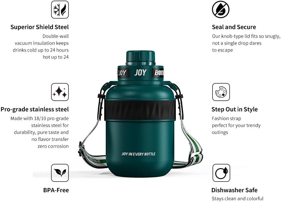 32 oz Stainless Steel Water Bottle with Strap, Double Vacuum Insulated Water Bottle Eco-Friendly and Dishwasher Safe Leakproof Closeable Lid for Cold Drinks Sports Travel School Car