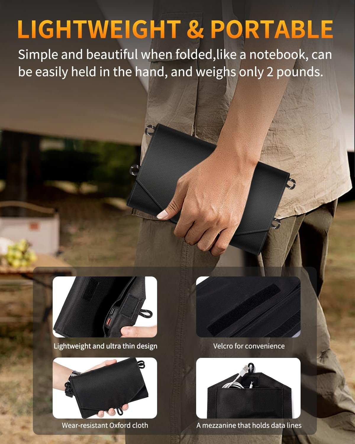 【The portable camping solar panel 】is designed specifically for mobile camping and off grid adventures. The 35W foldable solar panel is perfect for long-distance travel that requires more power without affecting portability. The compact size is 7.3 x 4.5 x 0.1 inches (when folded) and weighs 0.88 pounds (0.4 kilograms) less, making it easy to squeeze into your backpack for portability and simplicity. It is also a must-have item stored in emergency toolboxes.