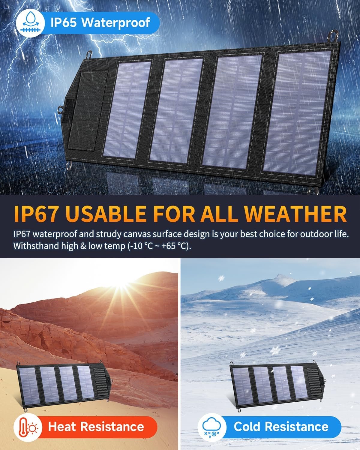 【 Solar panel charger 】 Built in 1 QC3.0 USB-A with a maximum output of 18W, 1 * PD 2.0 USB-C with a maximum output of 18W (5v-3A/9V-2A/12V-1.5A) and 19V DC (5.5 * 2.1mm) with a maximum output of 35W, can be directly connected to mobile phones, iPads, power banks, and small power stations. And other daily electronic devices USB-A and USB-C allow you to charge two electronic devices simultaneously. But do not recommend using a toghter for DC and USB ports to prevent slow charging speed. Attention: Solar panels cannot store power