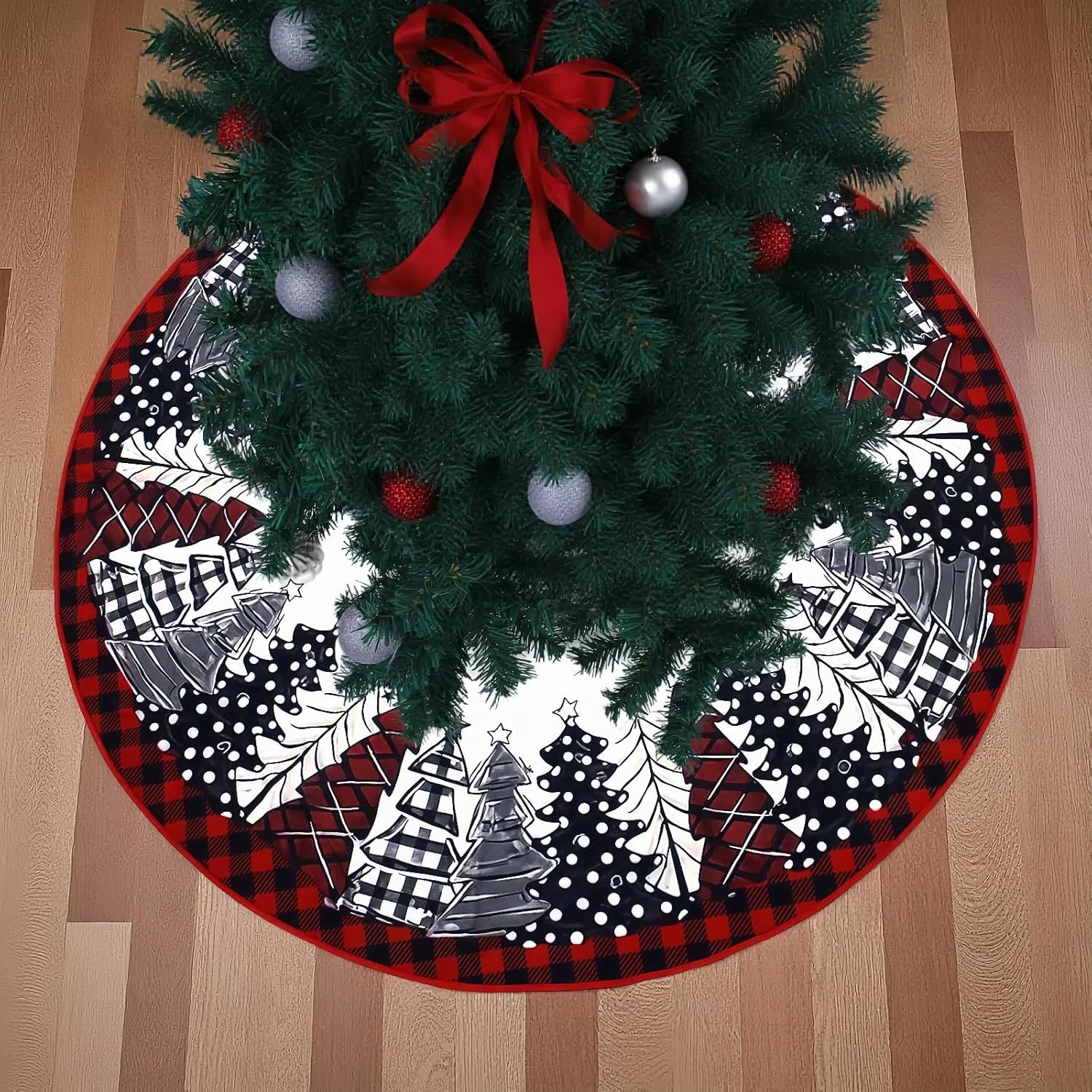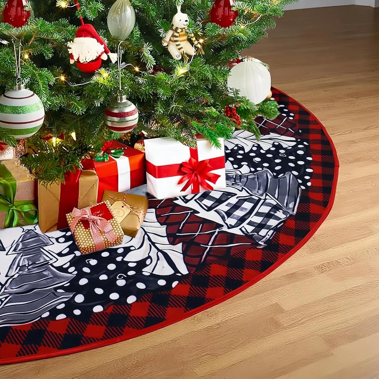 Add warmth and whimsy to your Christmas tree with this red plaid tree skirt. The playful combination of buffalo plaid and various patterned trees sprinkled with snowflakes creates a cozy, festive scene perfect for any holiday setup.
