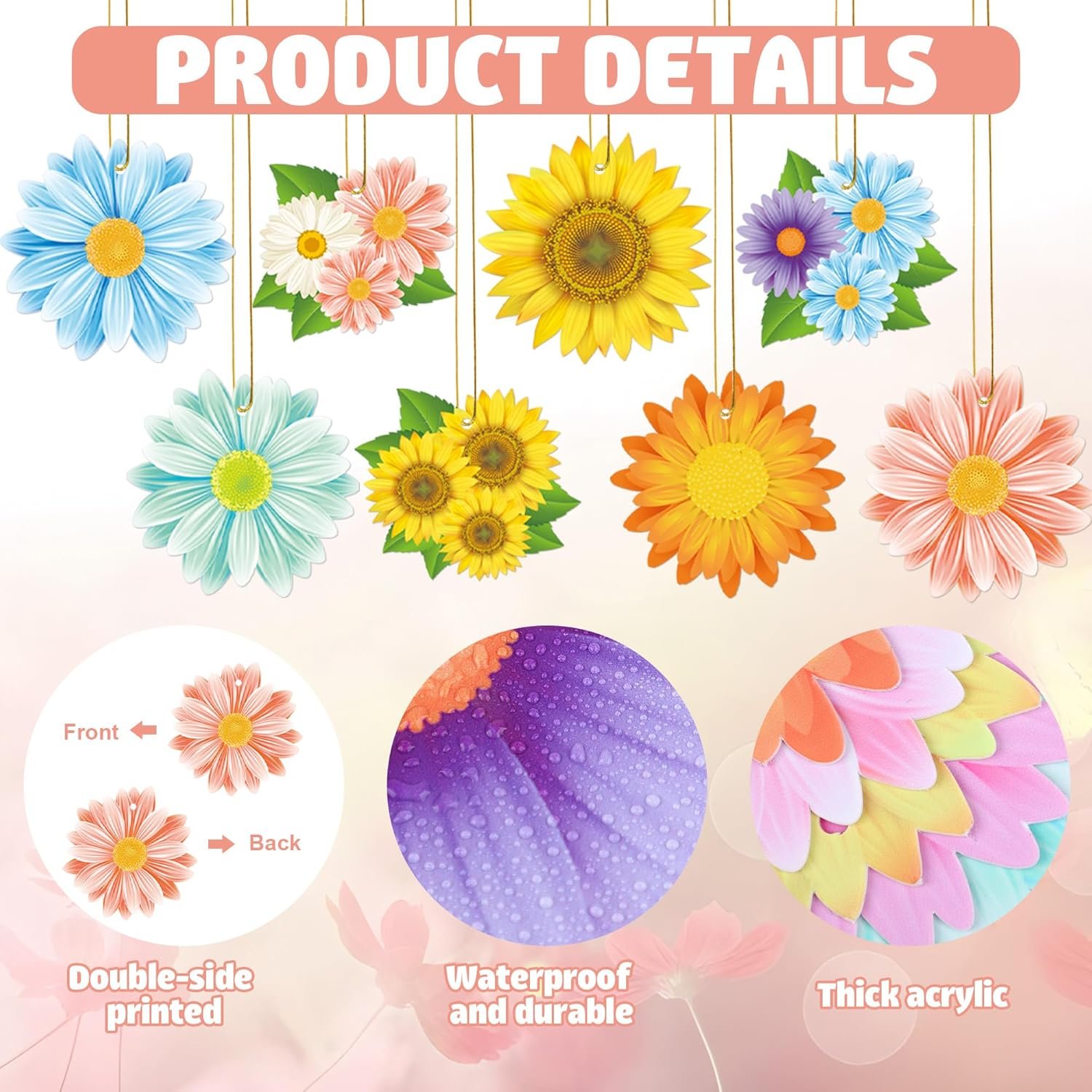 Premium material: the spring daisy flower ornaments are made of high quality plastic, thick, sturdy, lightweight and not easy to break, and the quality plastic material makes sure that the flower theme hanging ornaments are waterproof and they can serve you for a long time.