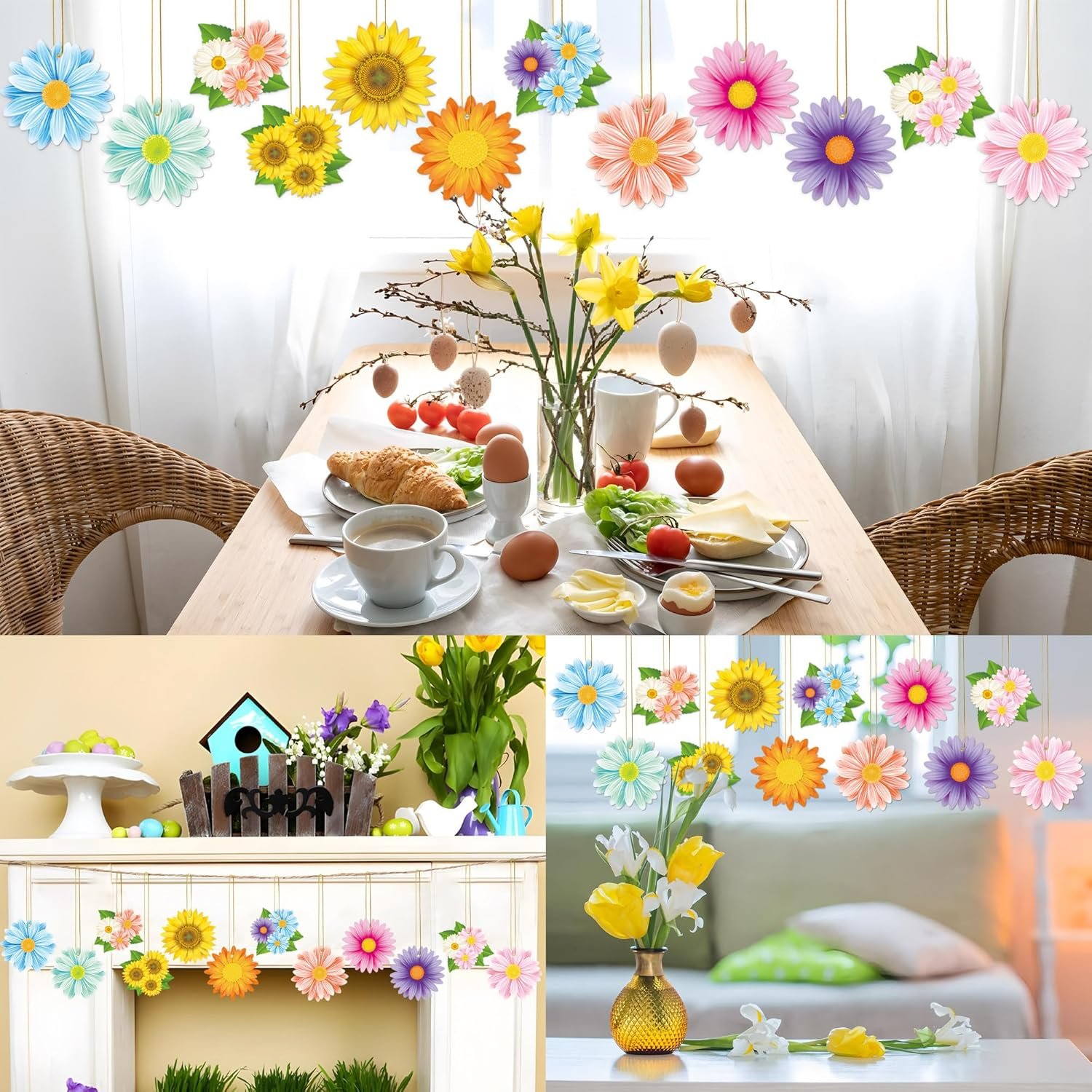 Easy to hang up: these spring plastic flower hanging decorations are very convenient to use, each plastic flower has a hole and we will provide one roll of rope that you could hang them where you want to decorate, such as tree branches in the backyard, ceiling, windows and more.