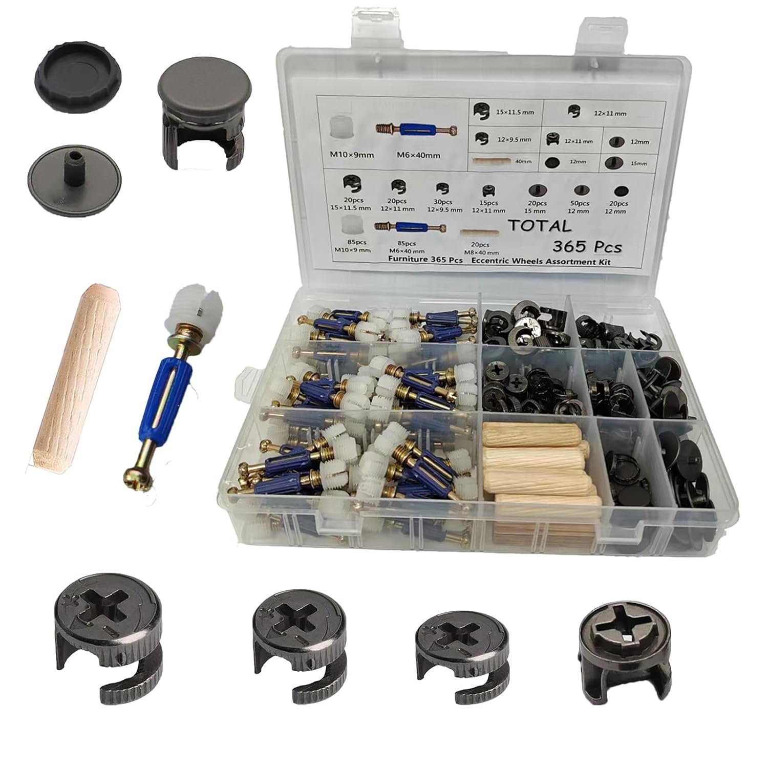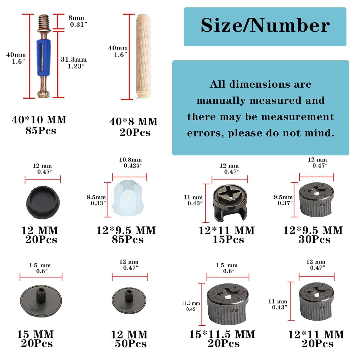 COMPLETE KIT: This 365pcs cam lock furniture hardware set size includes: 30 pieces 12*9.5mm cam screws,35 pieces 12*11mm cam screws, 20 pieces 15*11.5mm cam screws, 85 pieces M6*40mm cam lock screws, 85 pieces plastic expansion cam nuts,20pieces M8*40mm wood dowels and some decorative covers.In order for you to purchase the correct screw size, measuring the entire cam lock with a ruler is what you need to do.