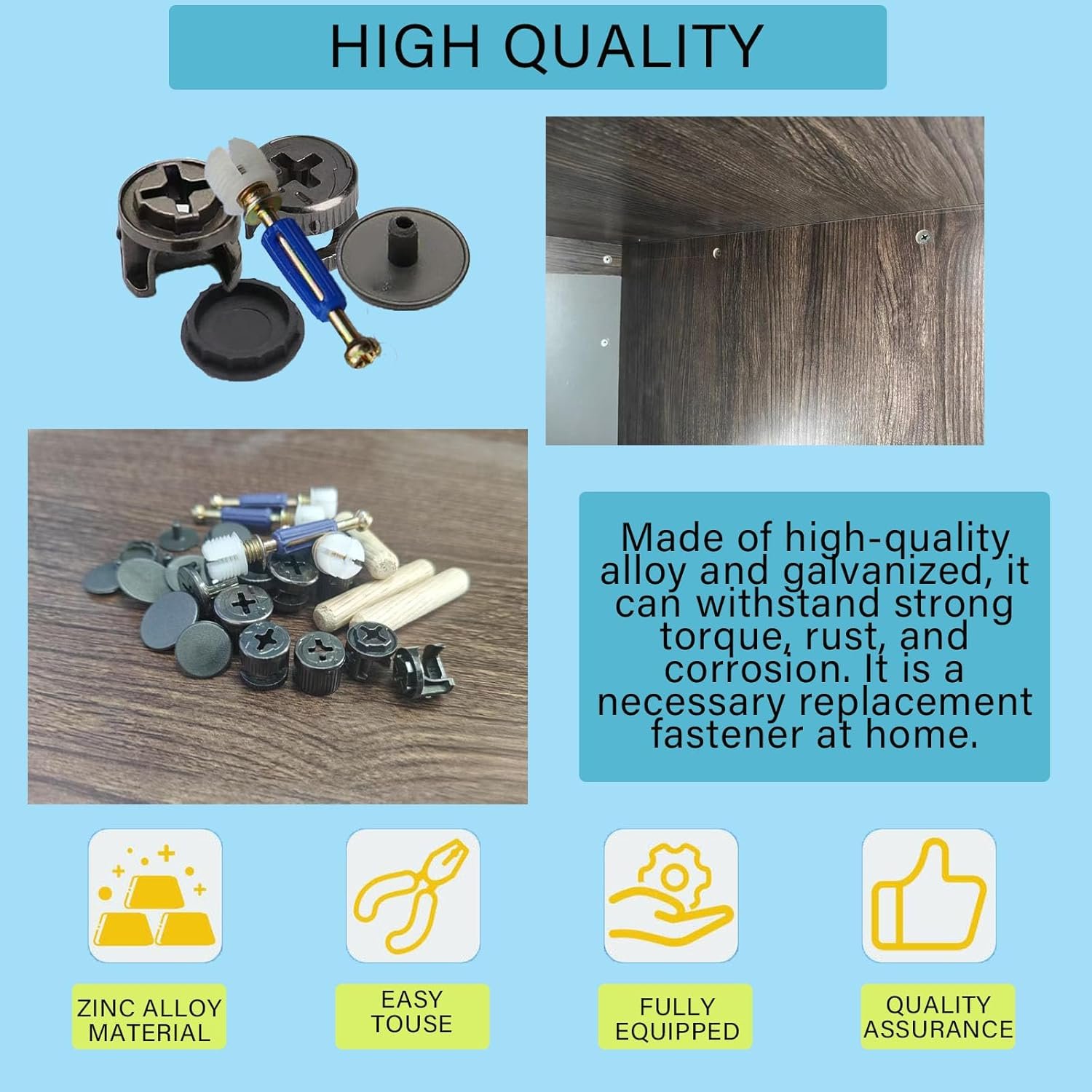 EASY INSTALLATION: The 3 in 1 Furniture cam lock nut structure is generally composed of a cylindrical shape and a driving cross groove, and an eccentric chute is added on the side. Wooden dowel is made of straight hardwood and the dowel pin has grooves , which is simple to use. The decorative cover for the three-in-one connector can not only effectively protect the screws from getting dirty, but also make the surface of the cabinet more simple and elegant.